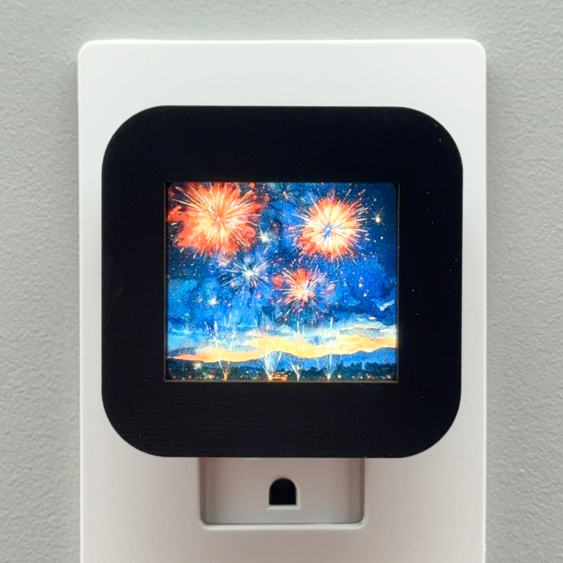 Illuminate your bathroom, hallway or bedroom with this beautiful 4th of July fireworks night light! The laser cut cover slides easily over the included LED nightlight without interfering with the sensor or vents, so it automatically glows when the room darkens and stays cool to the touch.
