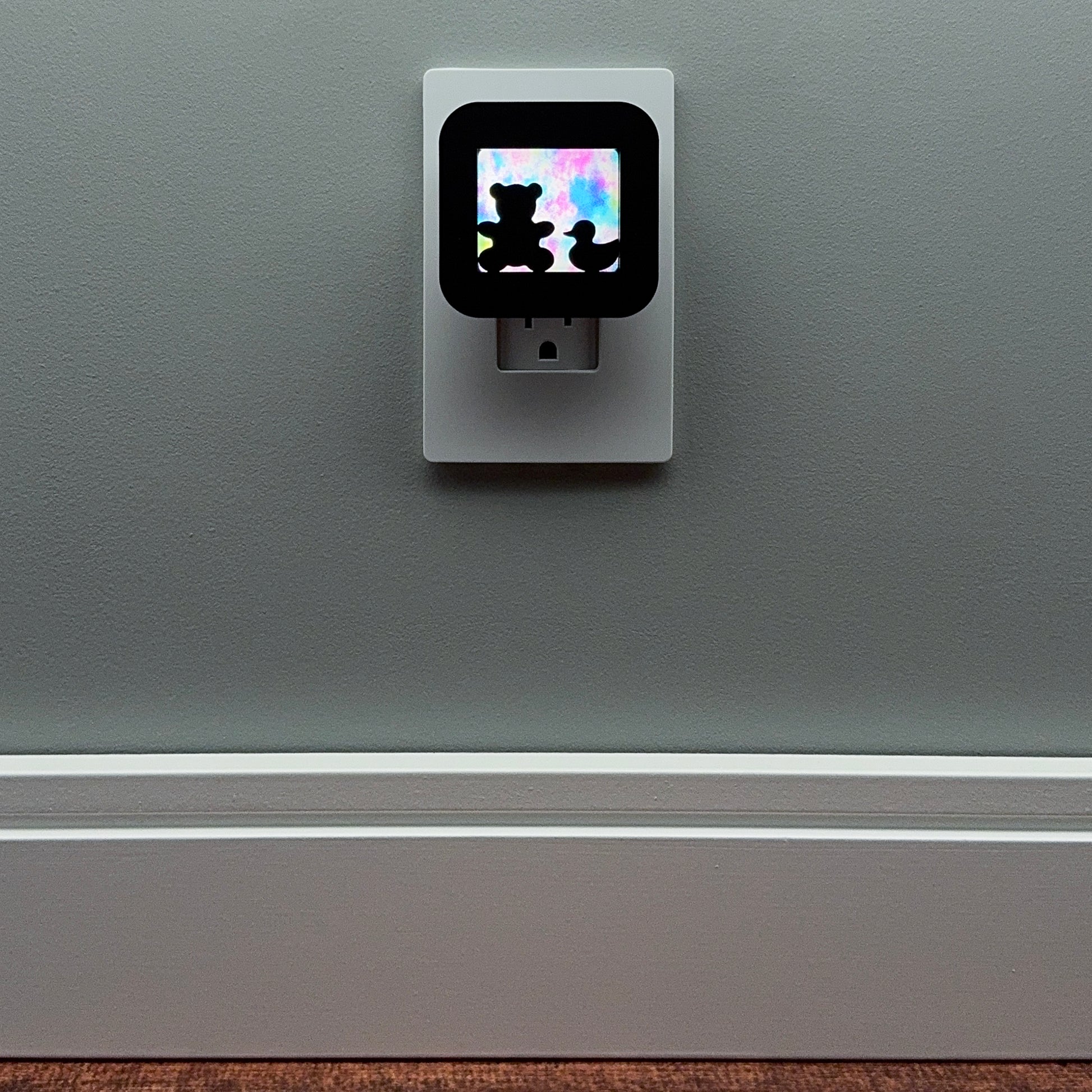 Illuminate your bathroom, hallway or bedroom with this beautiful teddy bear and duck night light! The laser cut cover slides easily over the included LED nightlight without interfering with the sensor or vents, and it automatically glows when the room darkens and stays cool to the touch.