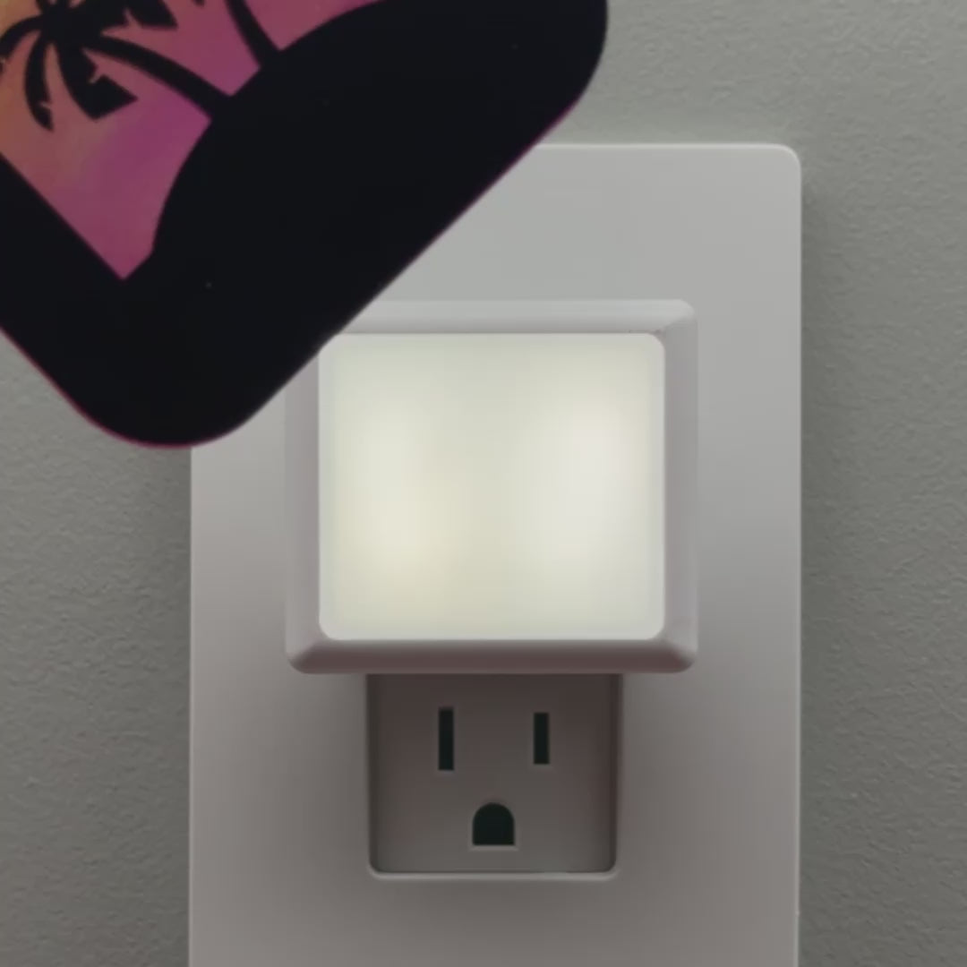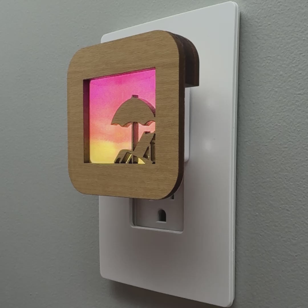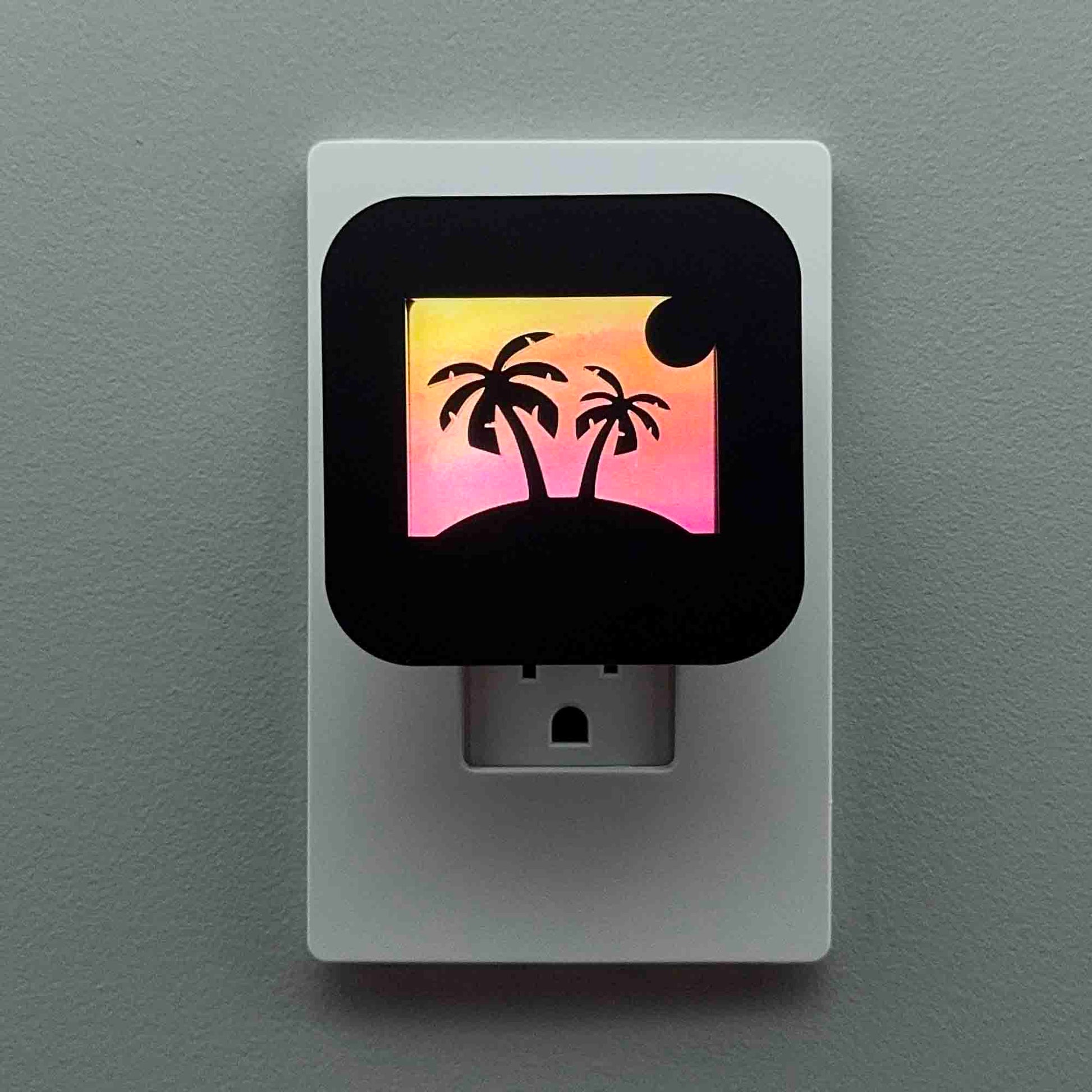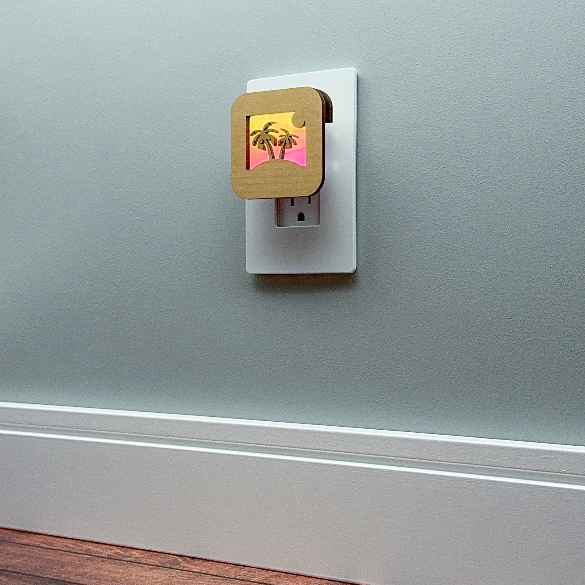 Illuminate your bathroom, hallway or bedroom with this beautiful beach sunset night light! The laser cut cover slides easily over the included LED nightlight without interfering with the sensor or vents, and it automatically glows when the room darkens and stays cool to the touch.