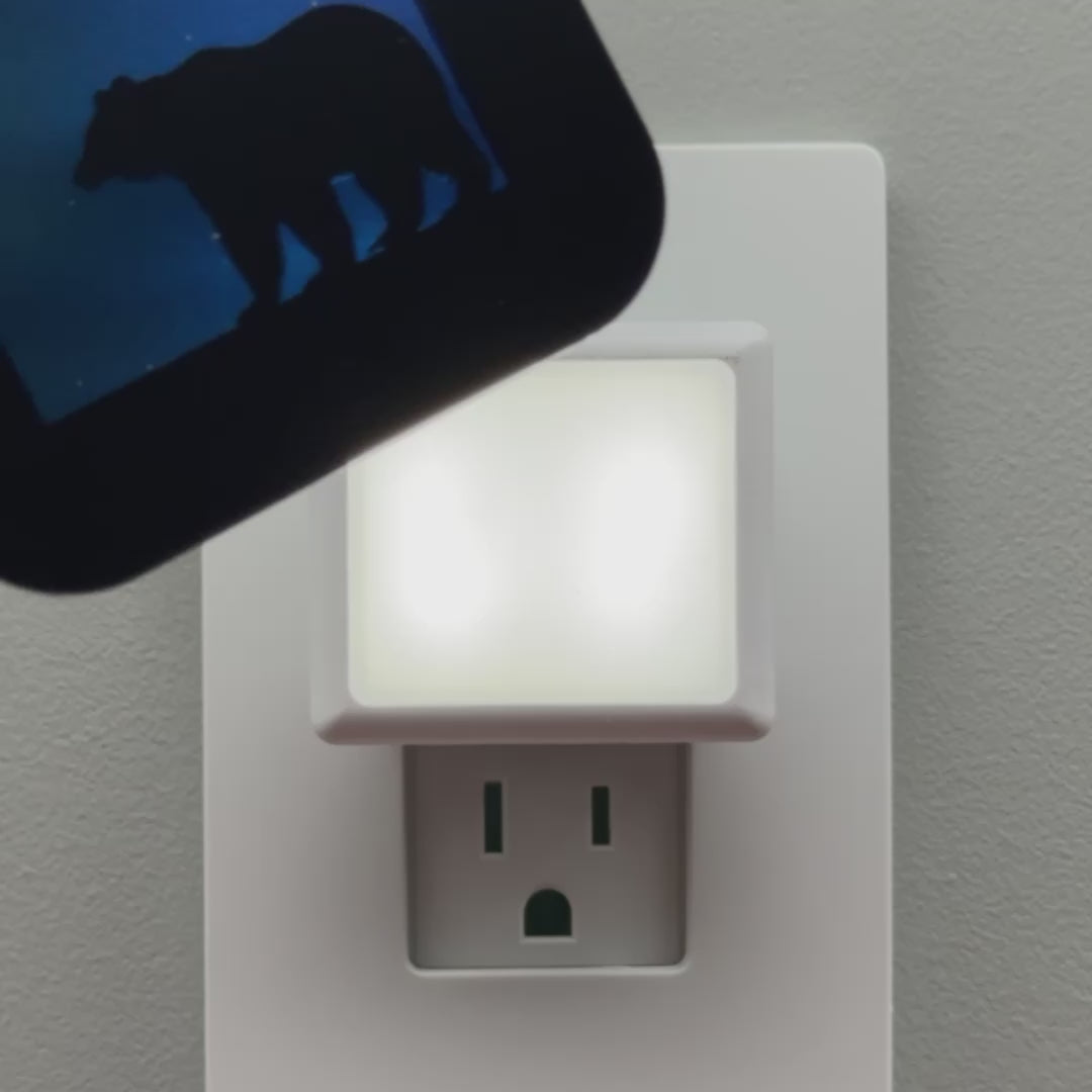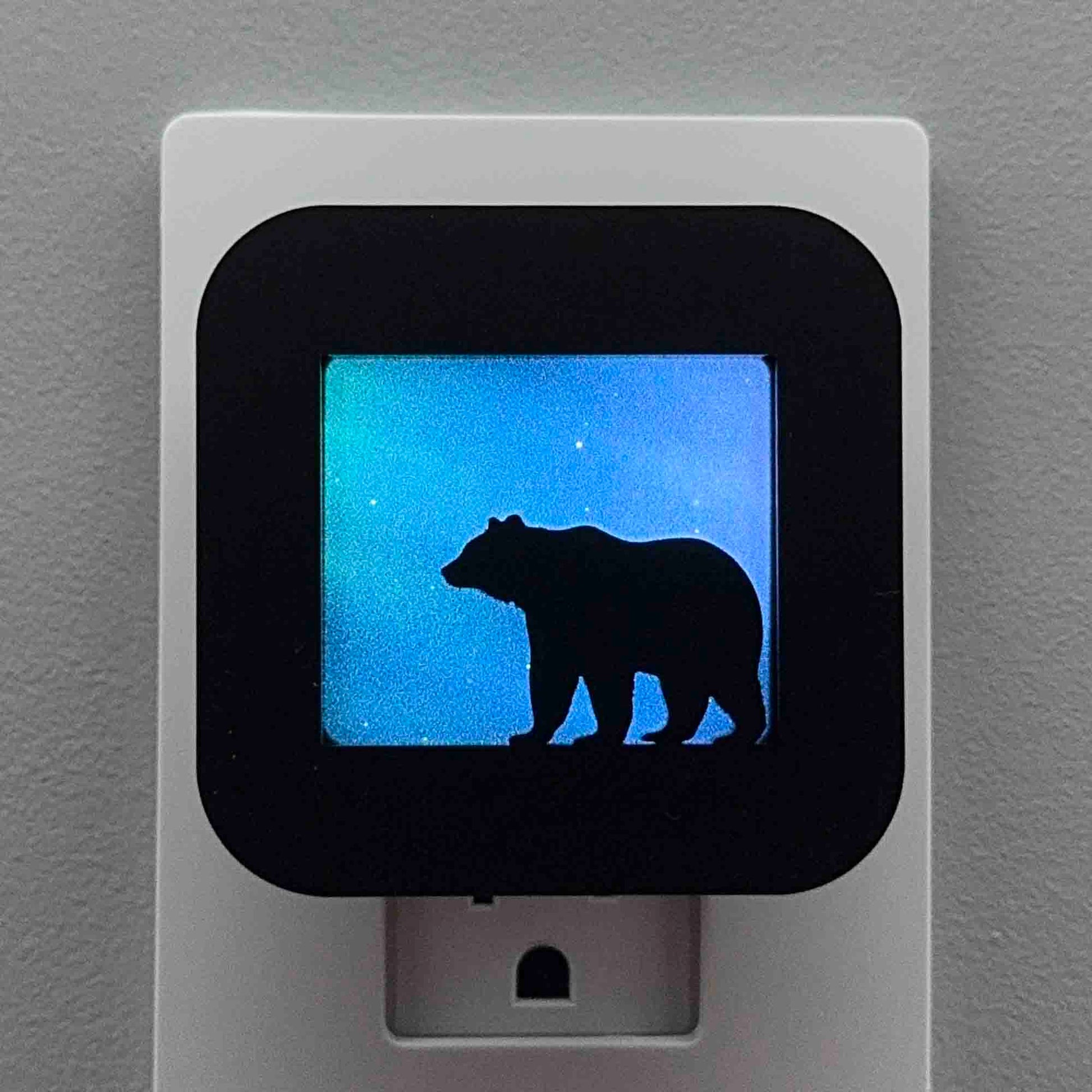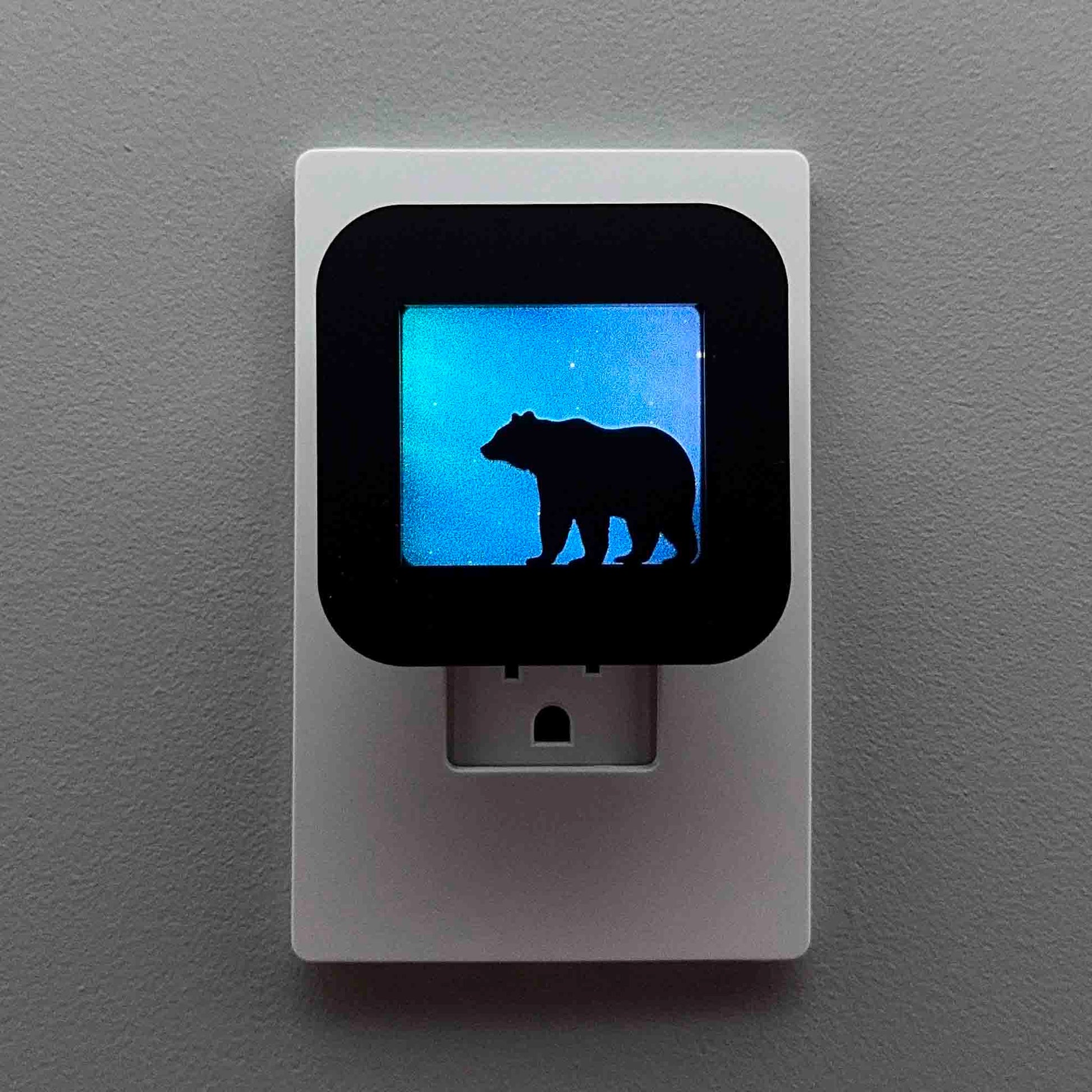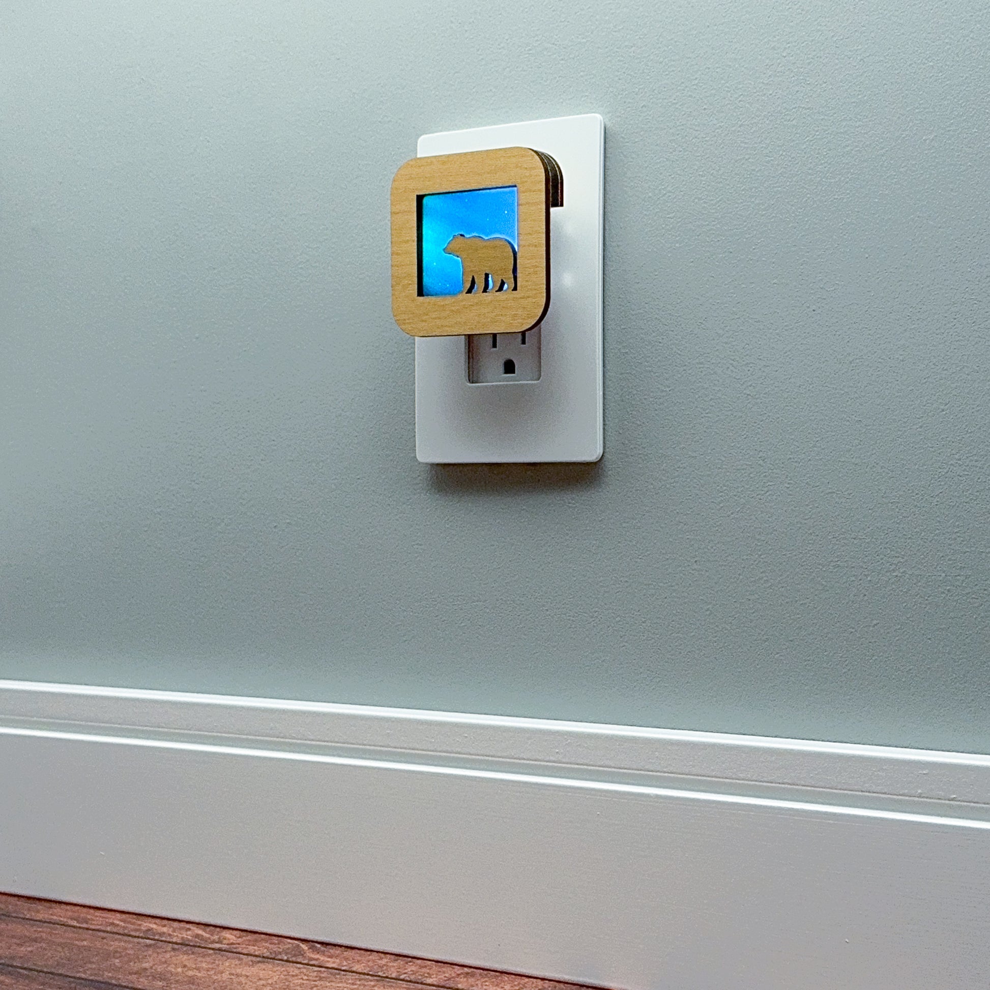 Illuminate your bathroom, hallway or bedroom with this beautiful bear Northern Lights night light! The laser cut cover slides easily over the included LED nightlight without interfering with the sensor or vents, so it automatically glows when the room darkens and stays cool to the touch.