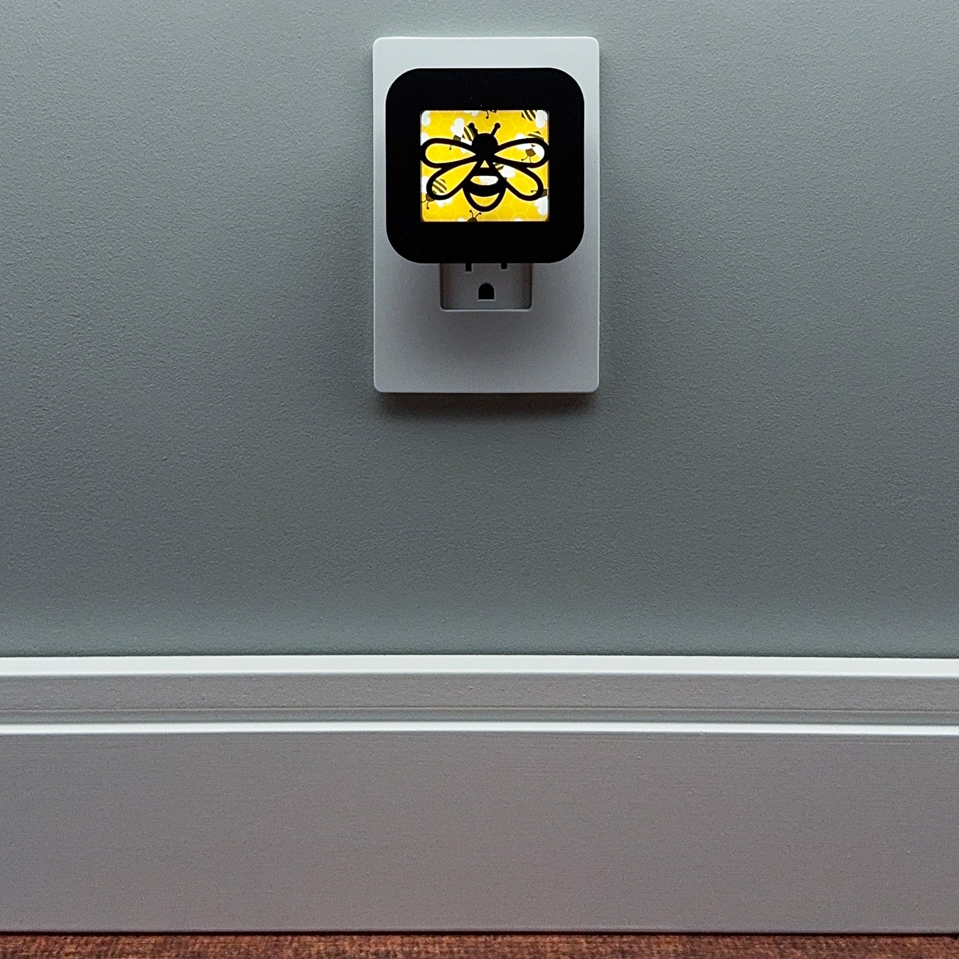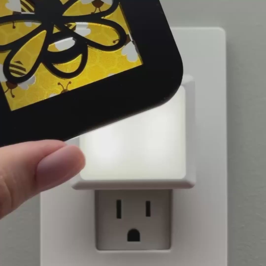 Illuminate your bathroom, hallway or bedroom with this bee night light! The laser cut cover slides easily over the included LED nightlight without interfering with the sensor or vents, so it automatically glows when the room darkens and stays cool to the touch.
