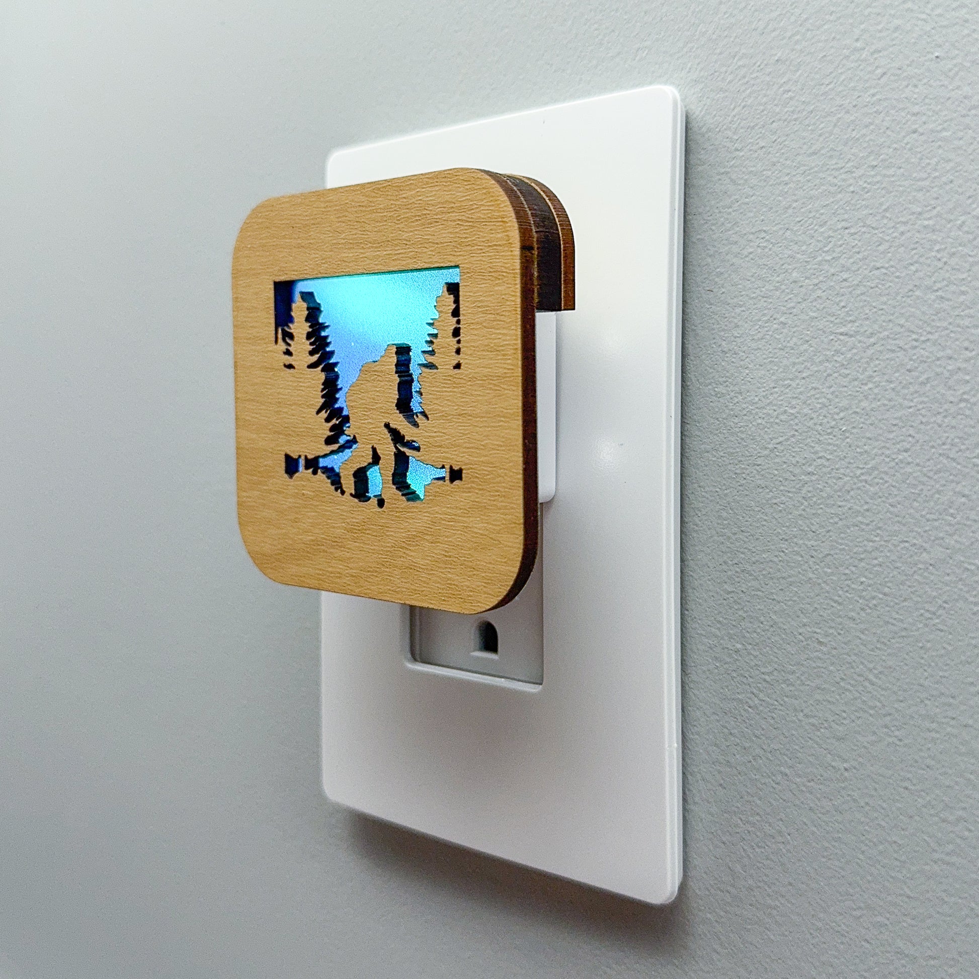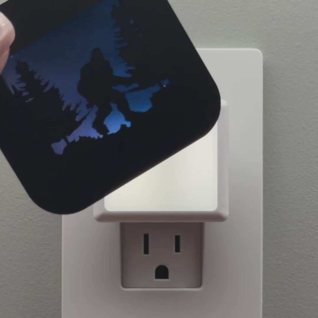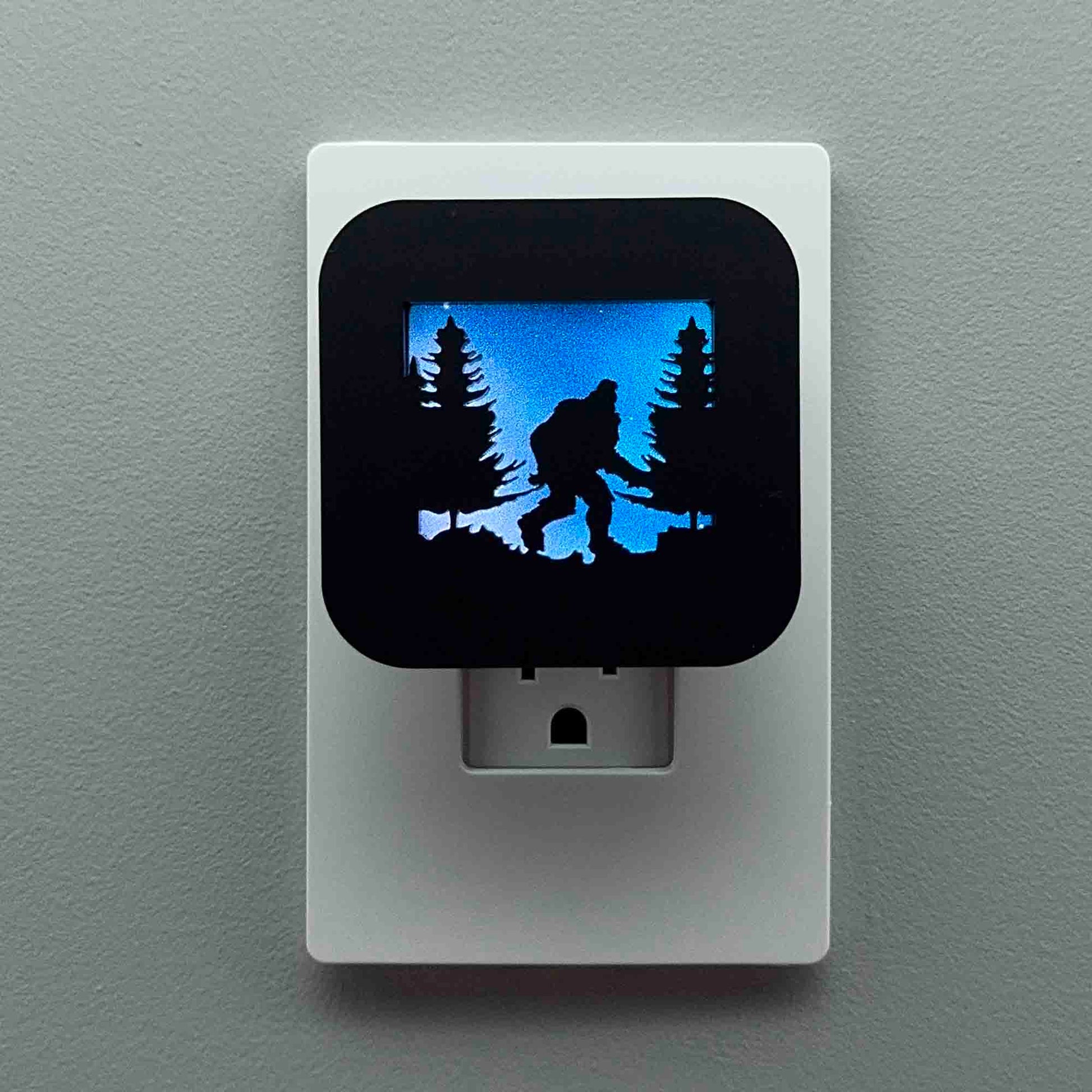 Illuminate your bathroom, hallway or bedroom with this Sasquatch night light! The laser cut cover slides easily over the included LED nightlight without interfering with the sensor or vents, and it automatically glows when the room darkens and stays cool to the touch.