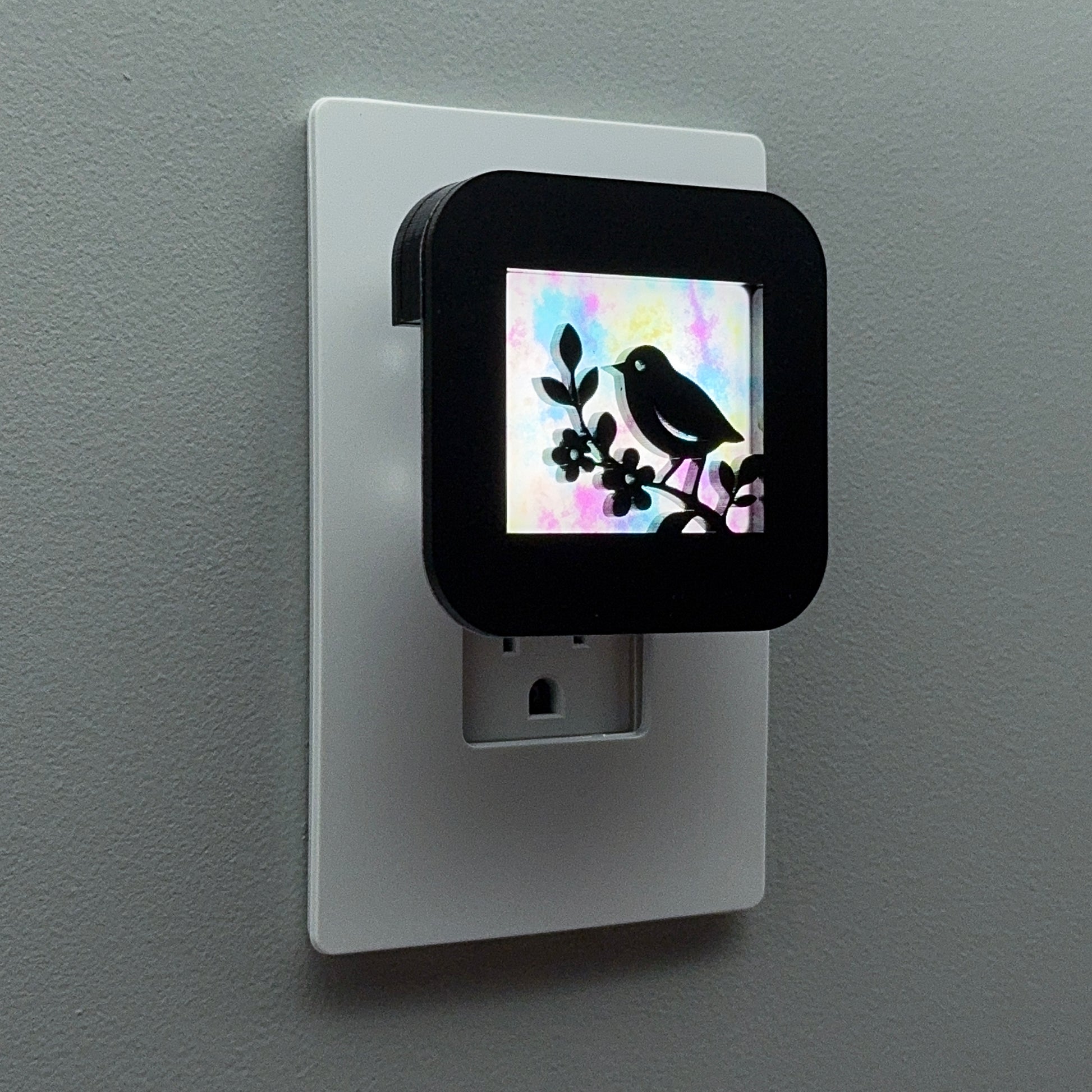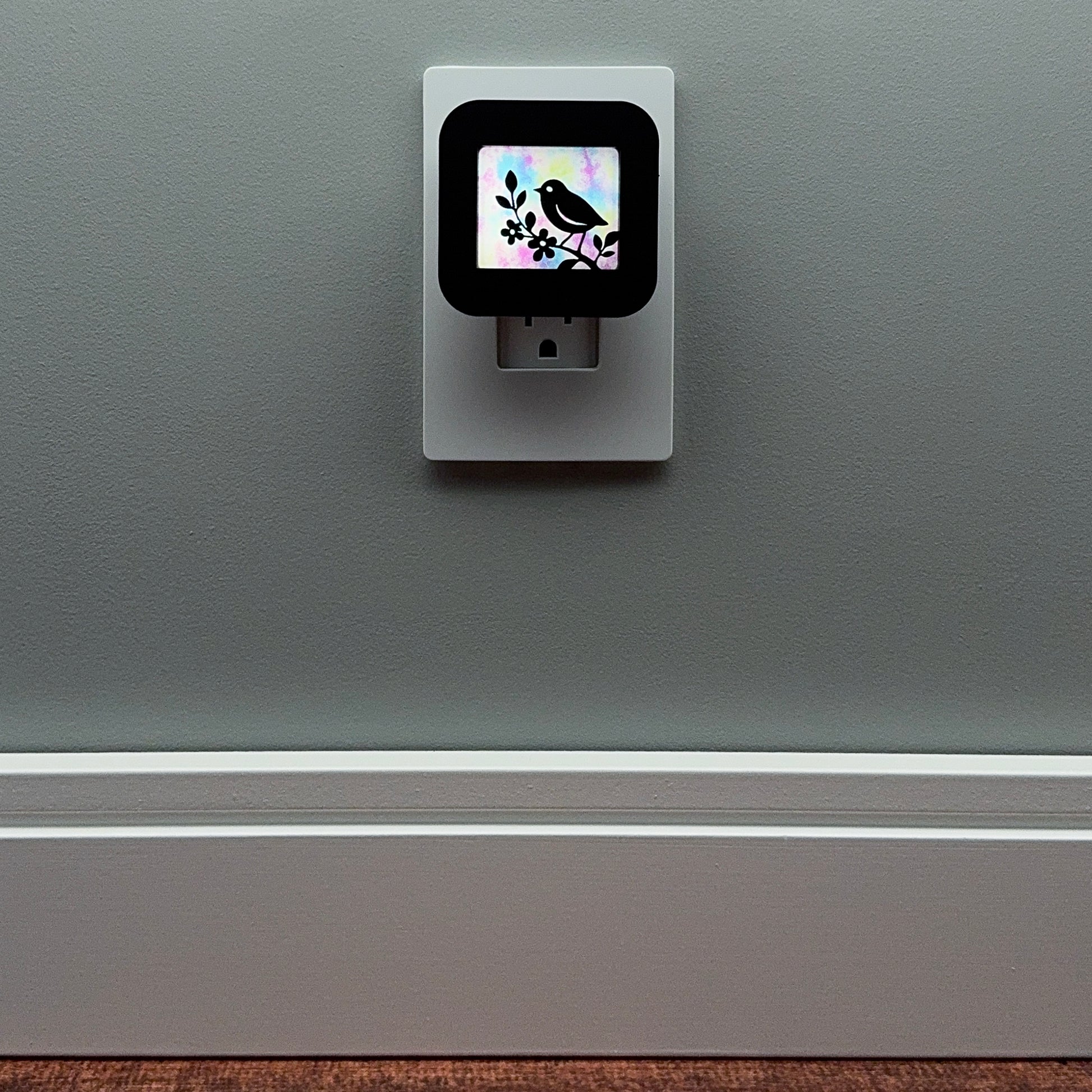 Illuminate your bathroom, hallway, nursery or bedroom with this cute bird and flowers night light! The laser cut cover slides easily over the included LED nightlight without interfering with the sensor or vents, so it automatically glows when the room darkens and stays cool to the touch.