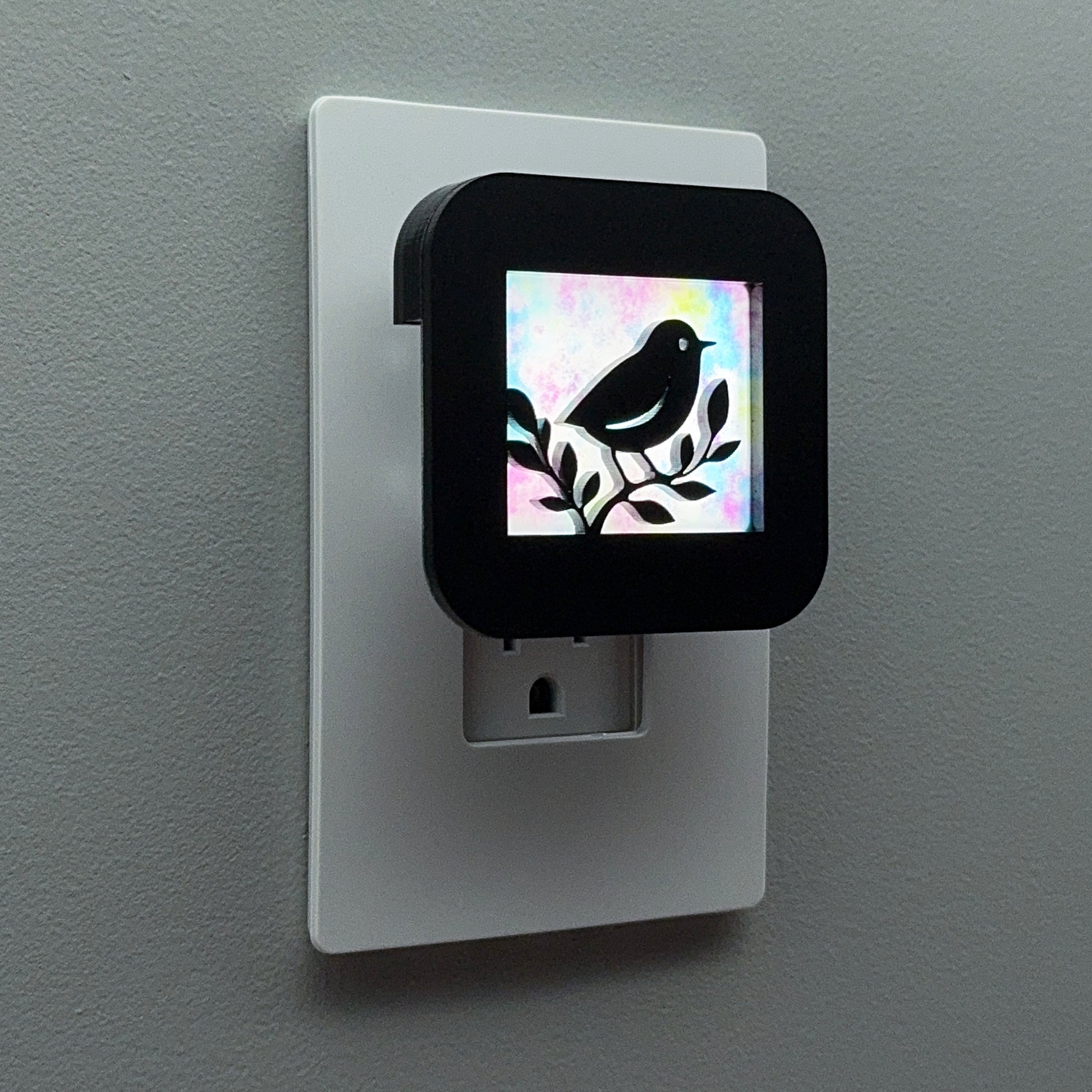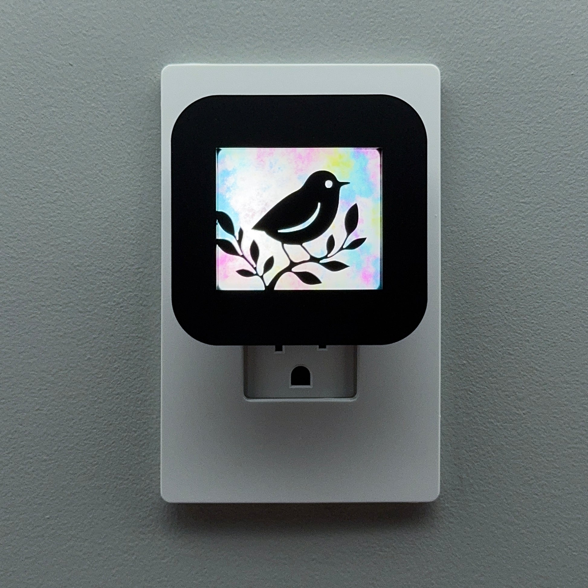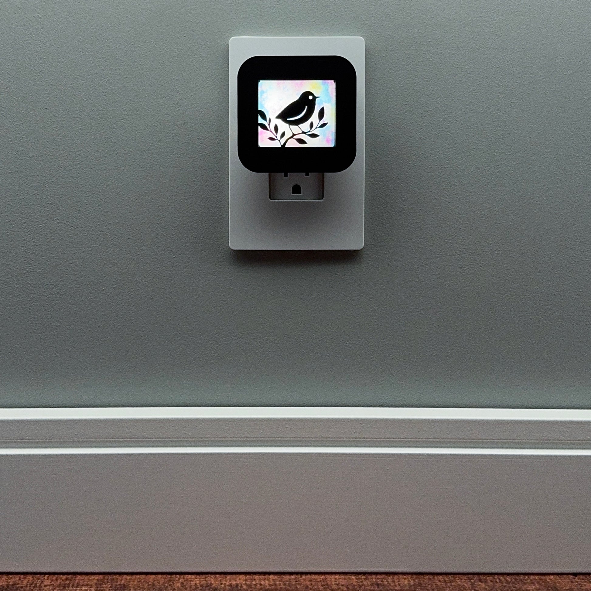 Illuminate your bathroom, hallway, nursery or bedroom with this cute bird in a tree night light! The laser cut cover slides easily over the included LED nightlight without interfering with the sensor or vents, so it automatically glows when the room darkens and stays cool to the touch.
