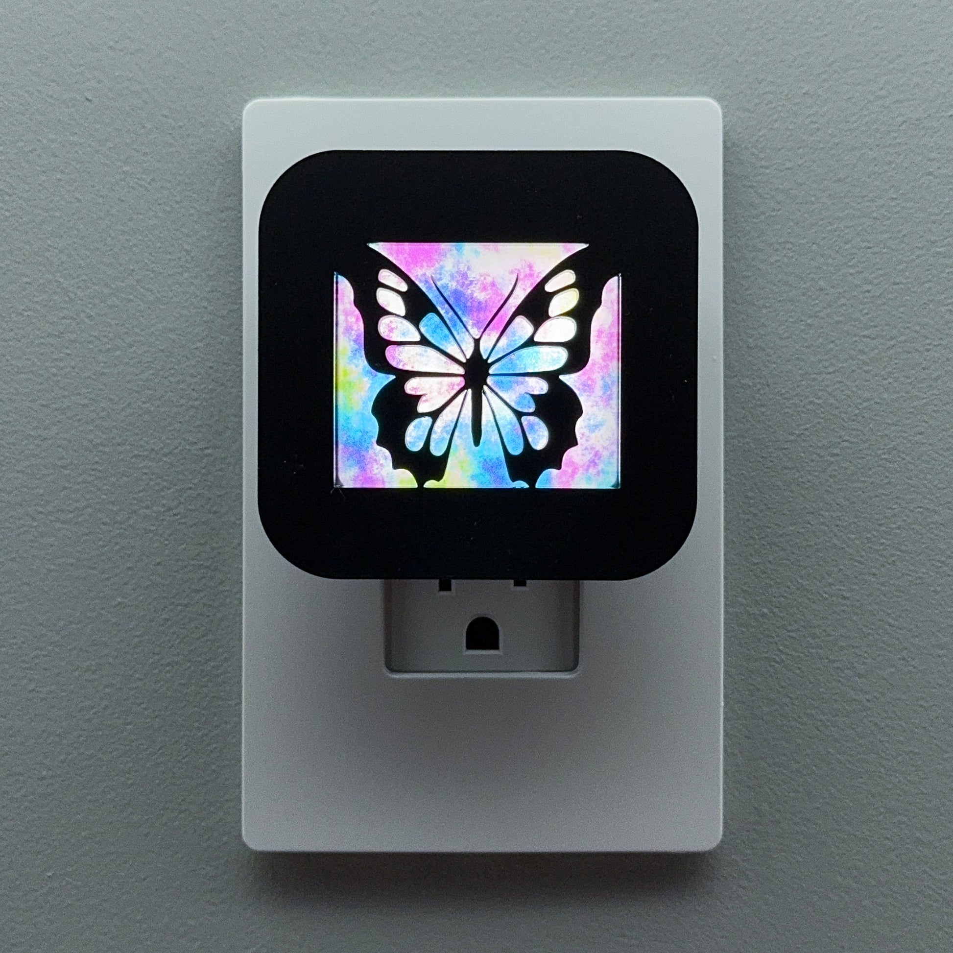 Illuminate your bathroom, hallway or bedroom with this beautiful butterfly night light! The laser cut cover slides easily over the included LED nightlight without interfering with the sensor or vents, so it automatically glows when the room darkens and stays cool to the touch.
