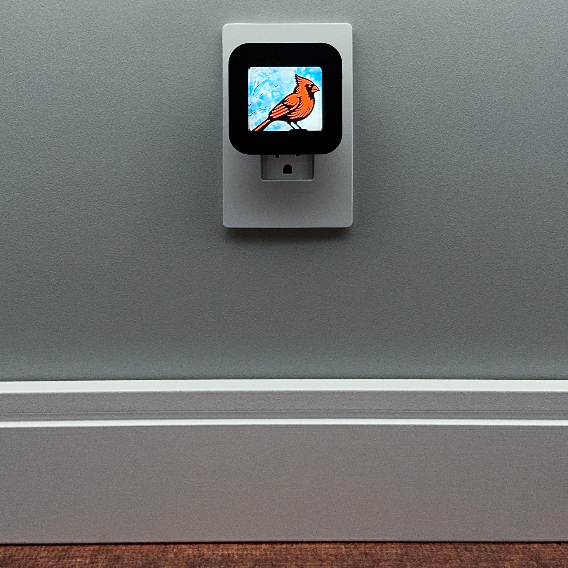 Brighten your home this winter with this plug-in night light, featuring a bold red cardinal set against a serene snowy tree background.