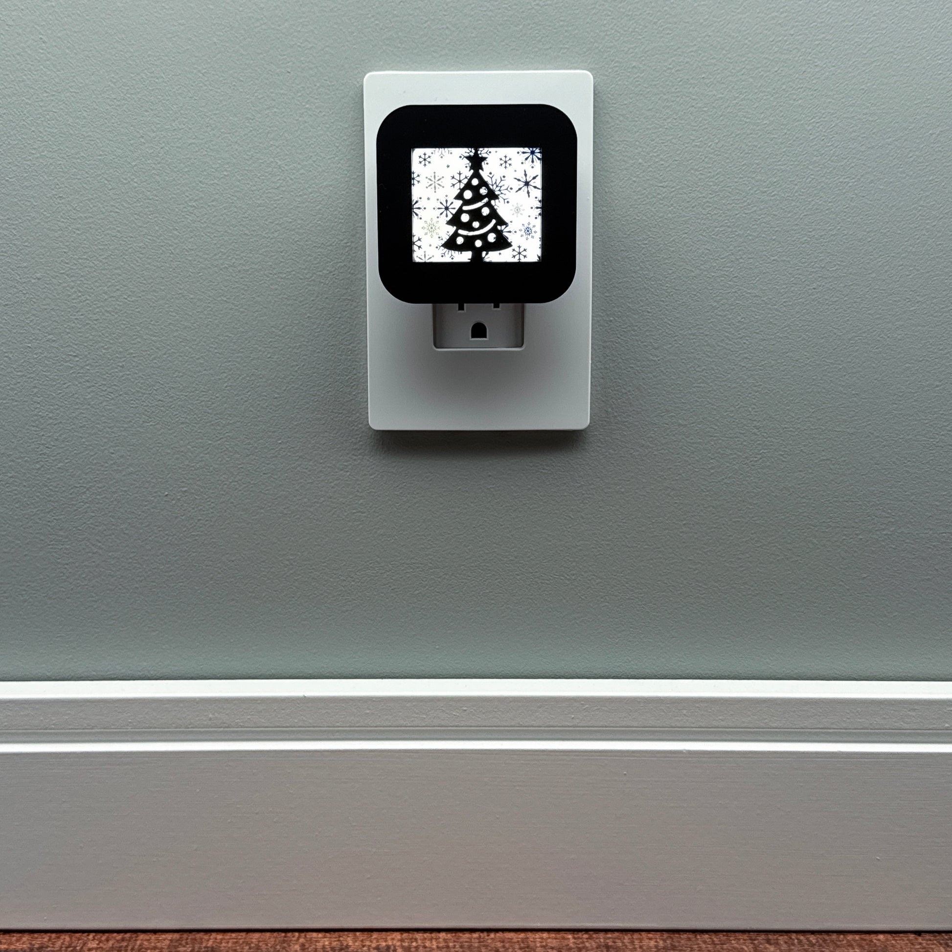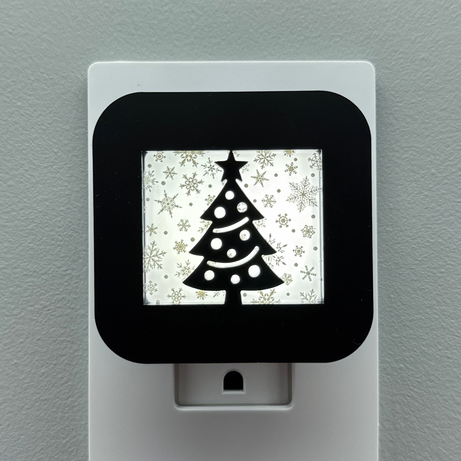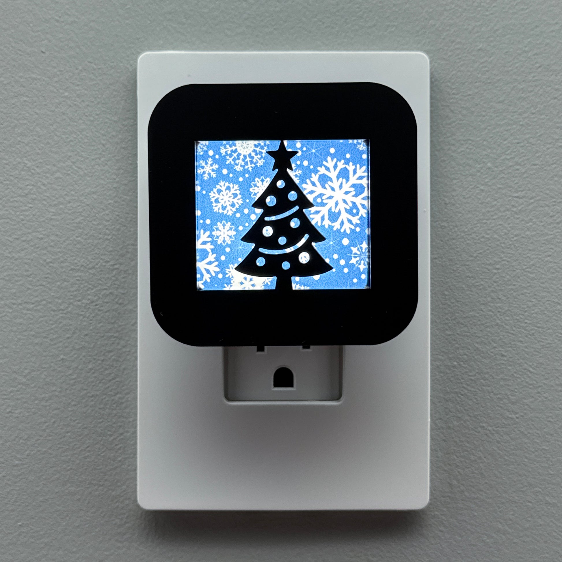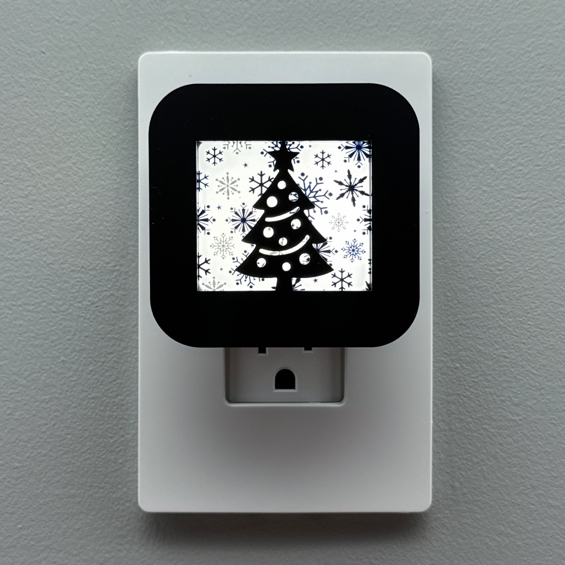 Celebrate the elegance of a white Christmas with this festive plug-in night light, featuring a classic Christmas tree silhouette set against your choice of three beautiful, intricate snowflake background patterns.