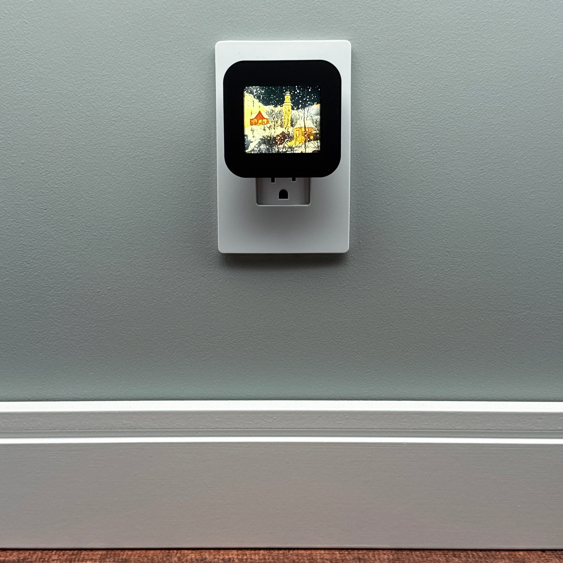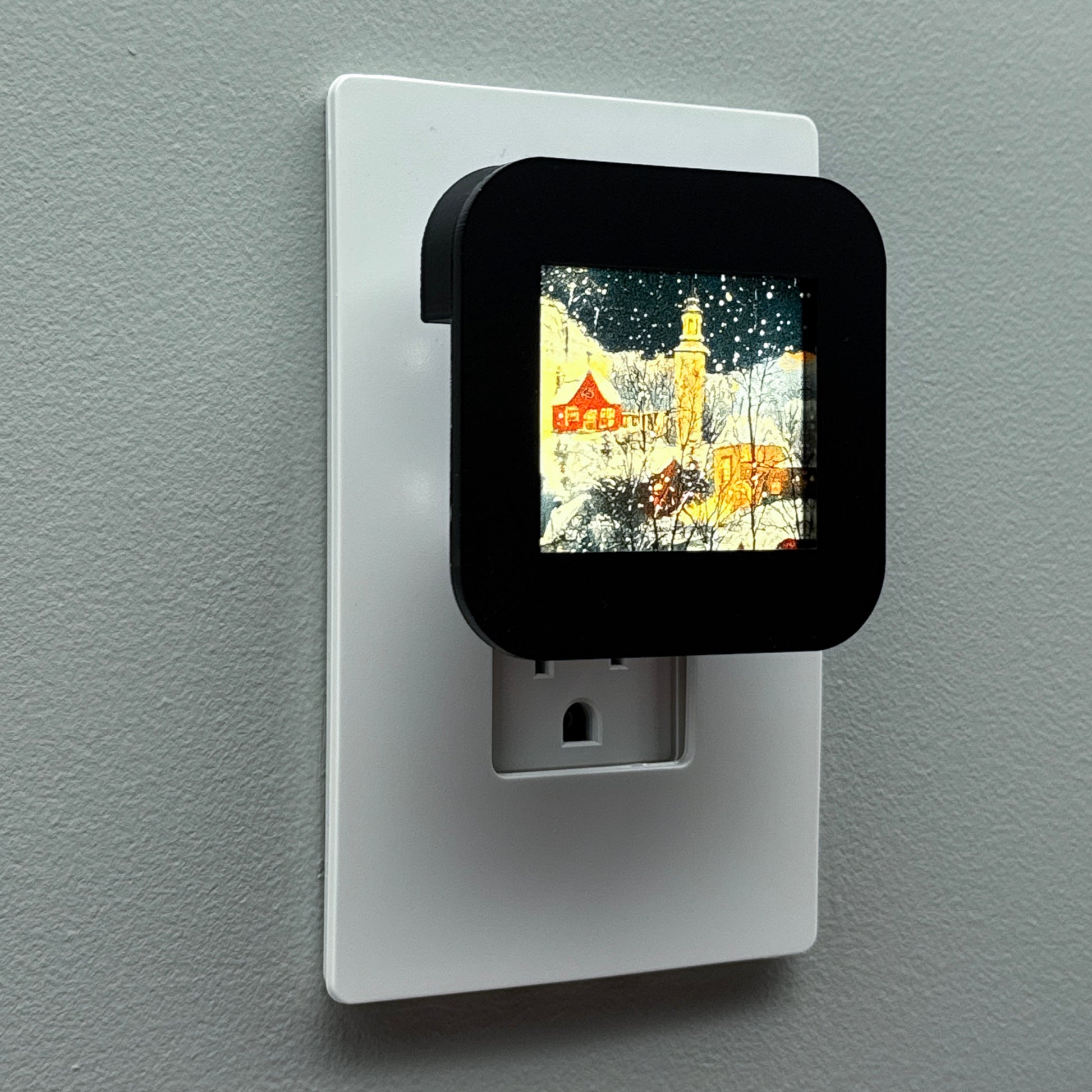 Step into a winter wonderland with this enchanting plug-in night light, featuring a classic, snow-covered Christmas village scene. Warm golden light spills from the windows of rustic homes and illuminates the central church steeple under a gentle snowfall.