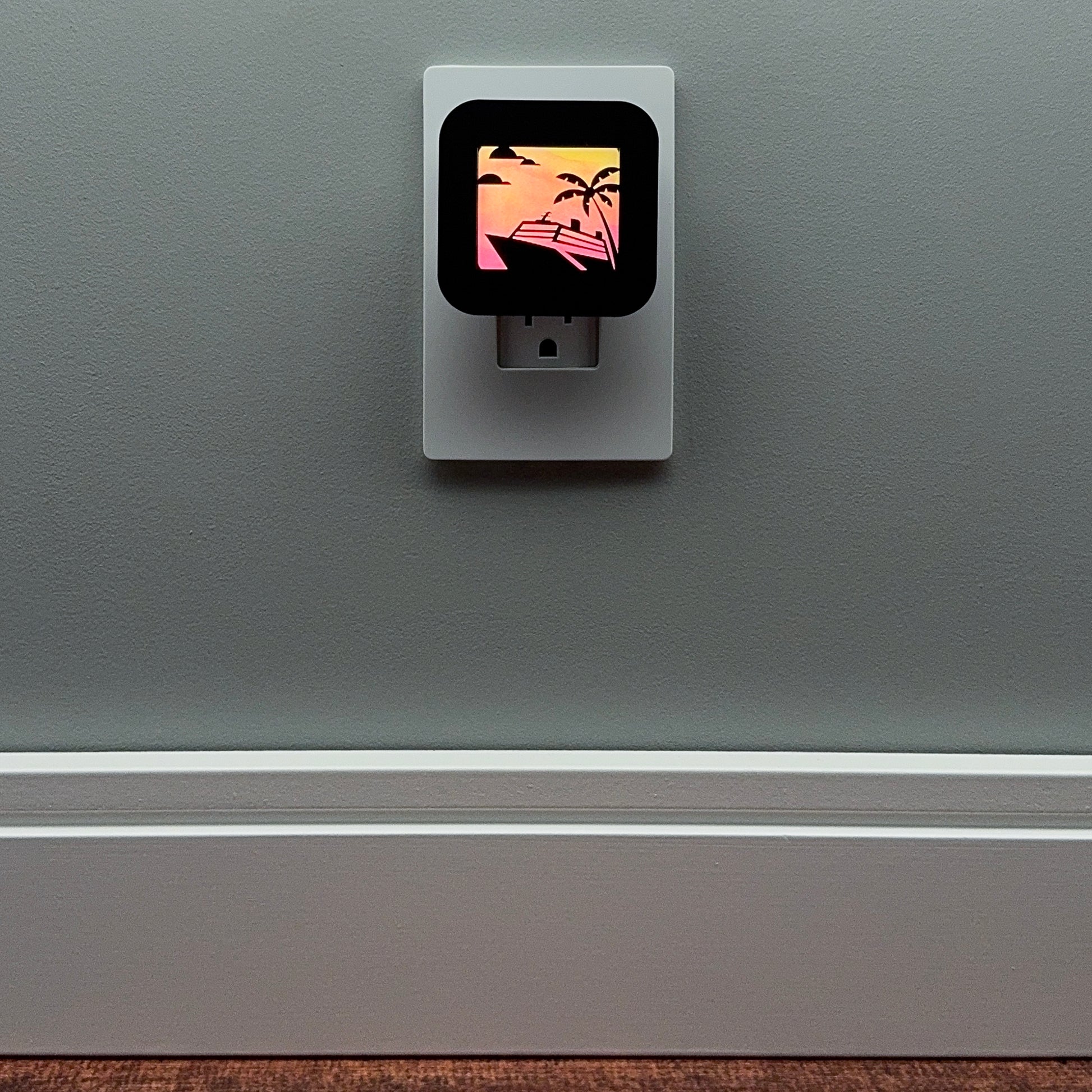 Set sail to relaxation with this vibrant plug-in night light, featuring a silhouette of a cruise ship sailing past a palm tree under a stunning pink and orange tropical sunset.