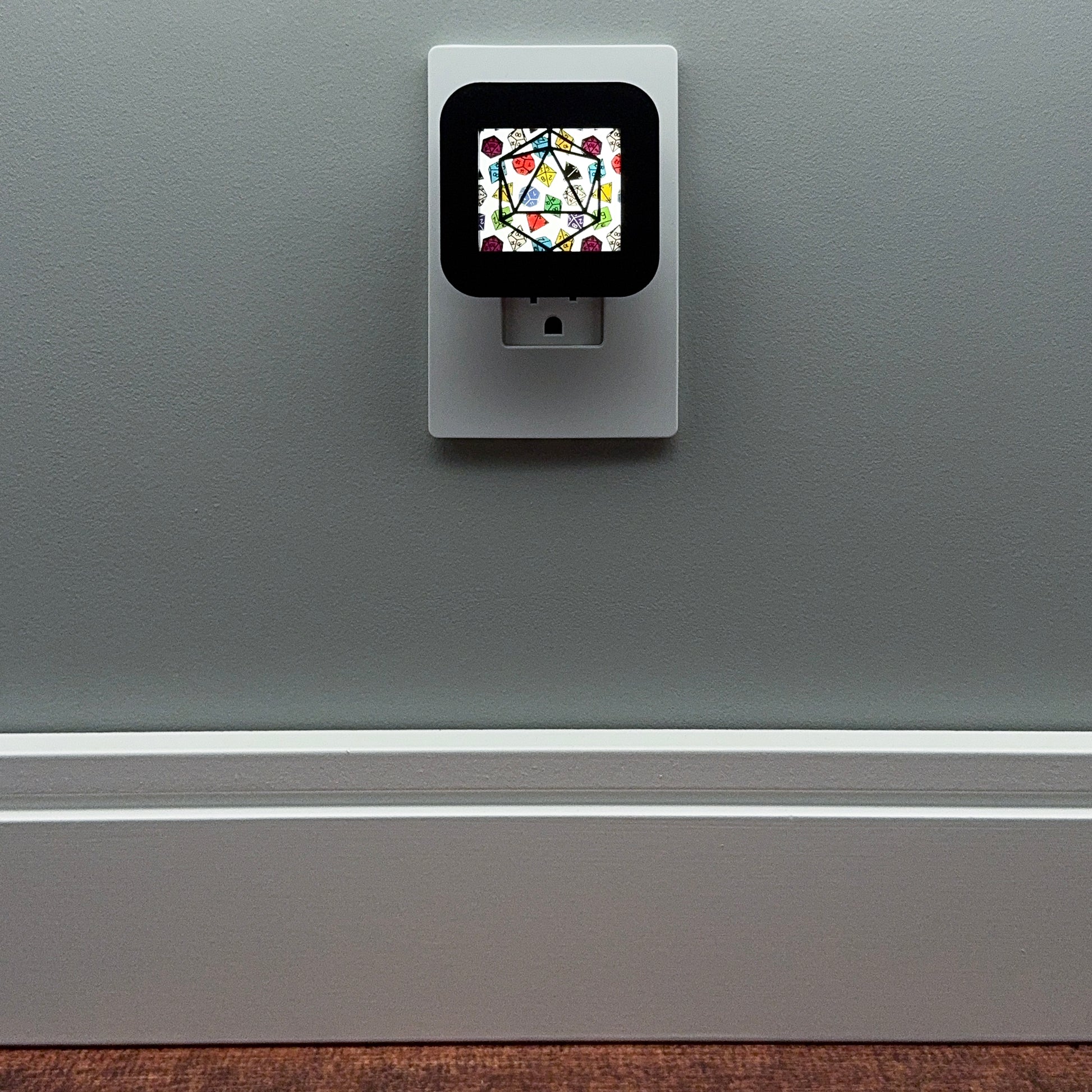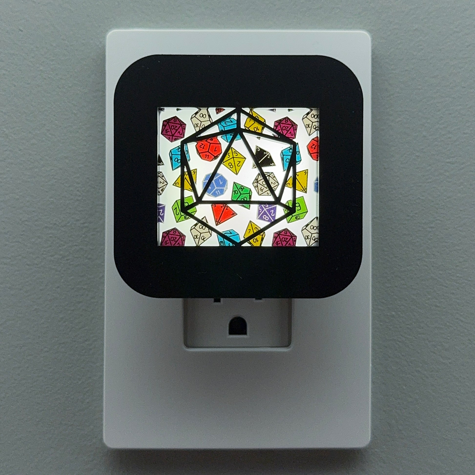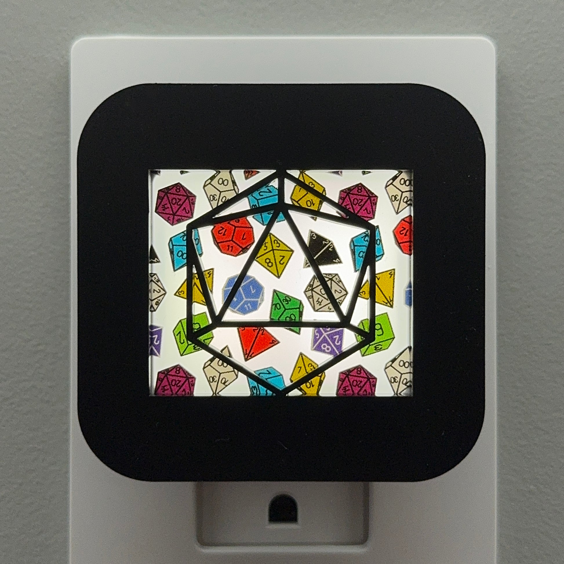 Roll the dice on fun with this colorful plug-in night light, featuring a bold D20 dice silhouette set against a background pattern of colorful polyhedral dice.