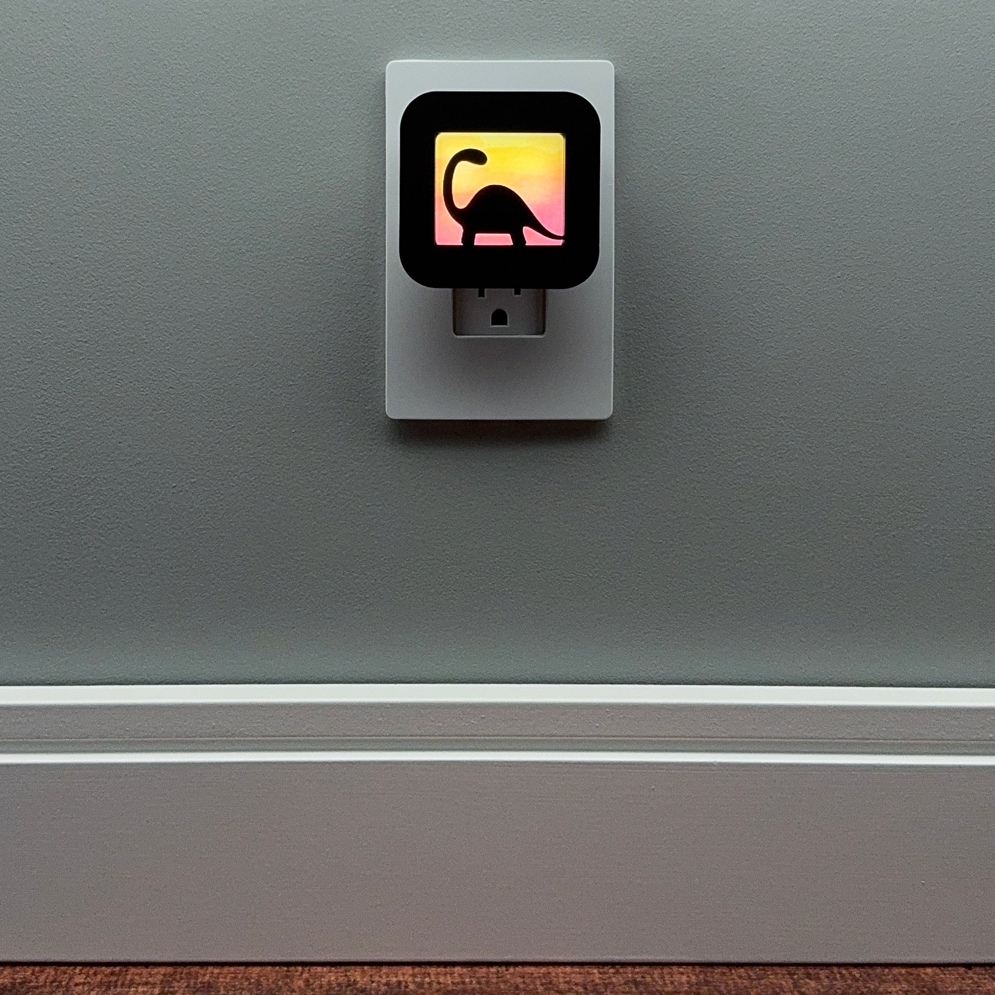 Illuminate your bathroom, hallway or kids bedroom with this colorful brontosaurus dinosaur night light! The laser cut cover slides easily over the included LED nightlight without interfering with the sensor or vents, and it automatically glows when the room darkens and stays cool to the touch.