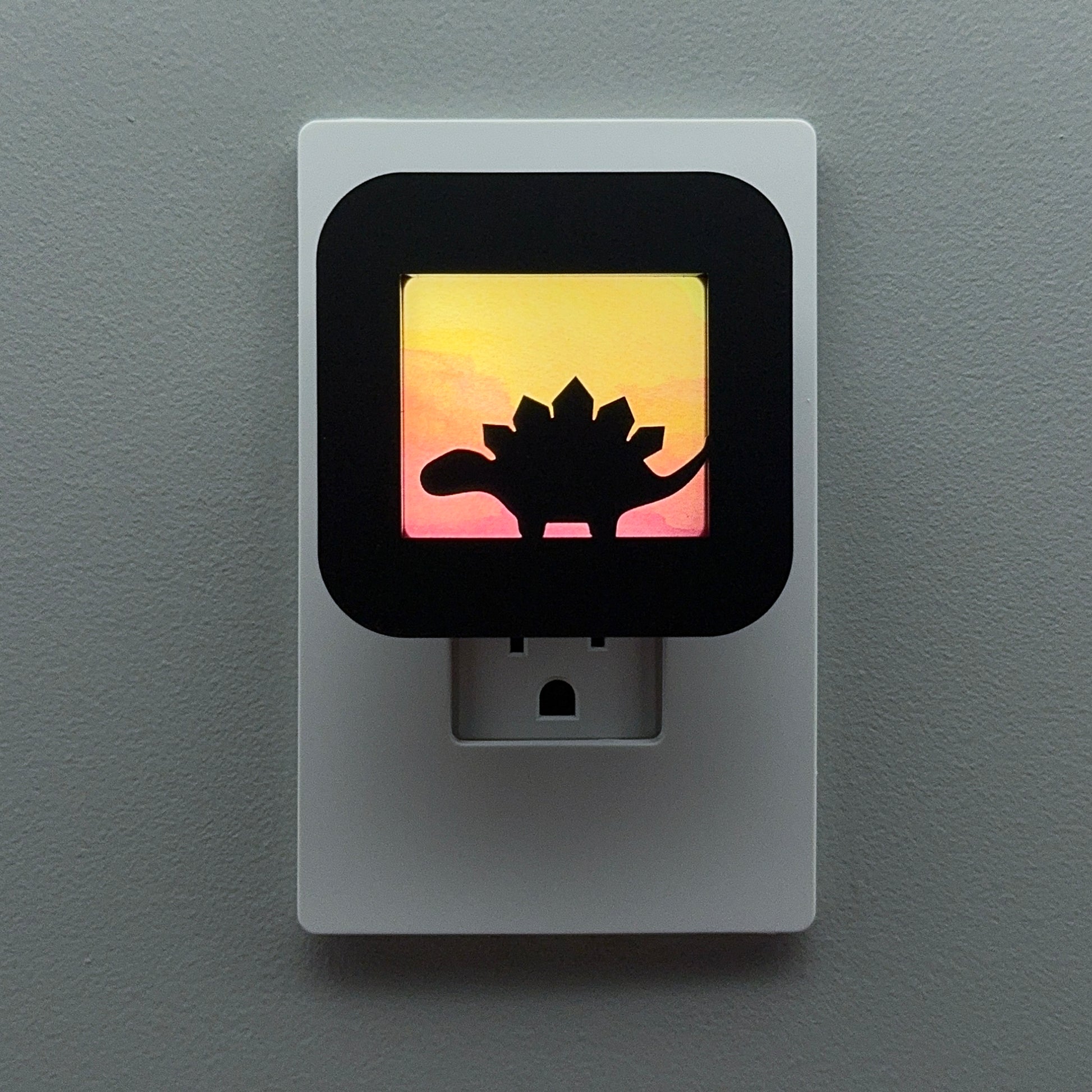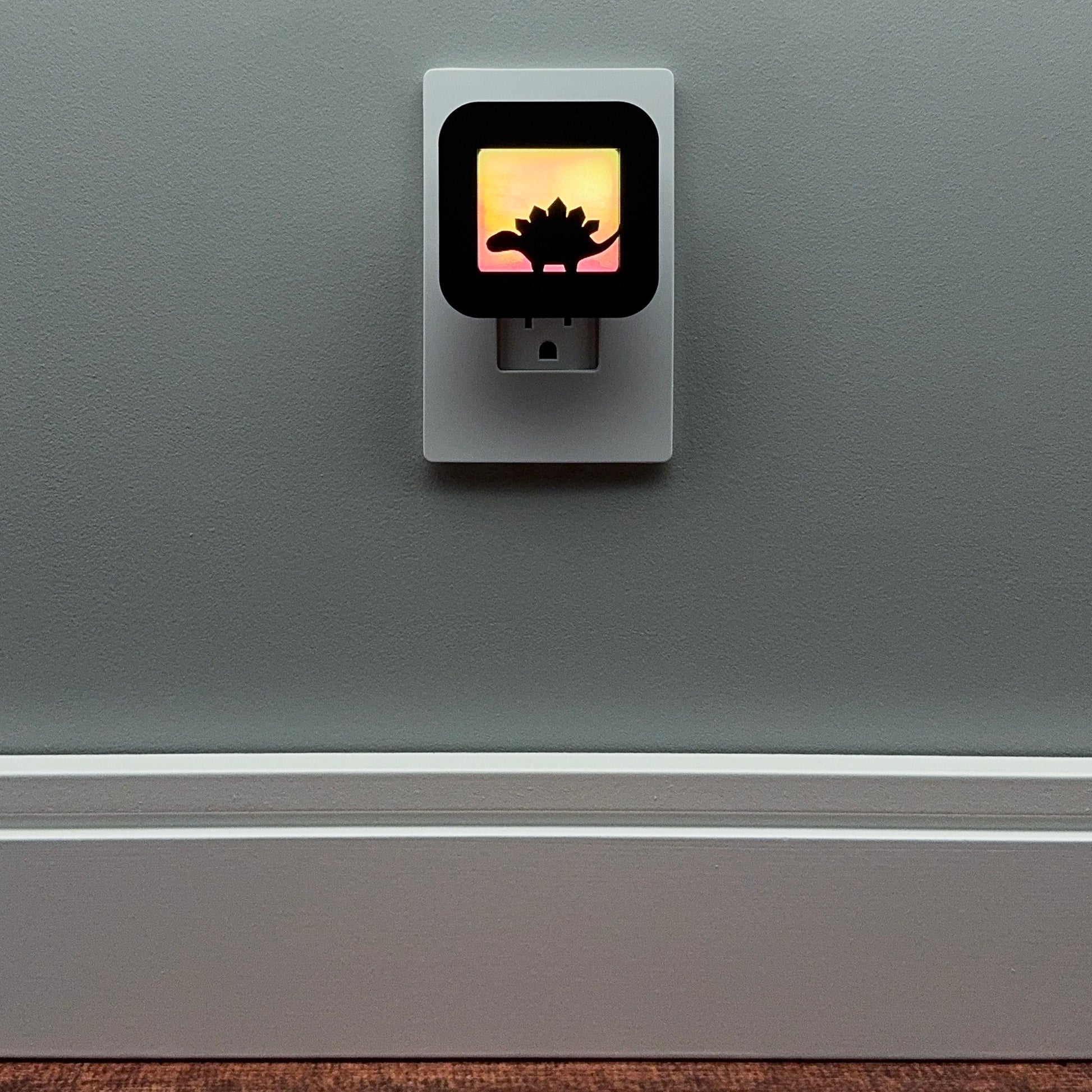 Illuminate your bathroom, hallway or kids bedroom with this colorful stegosaurus dinosaur night light! The laser cut cover slides easily over the included LED nightlight without interfering with the sensor or vents, and it automatically glows when the room darkens and stays cool to the touch.