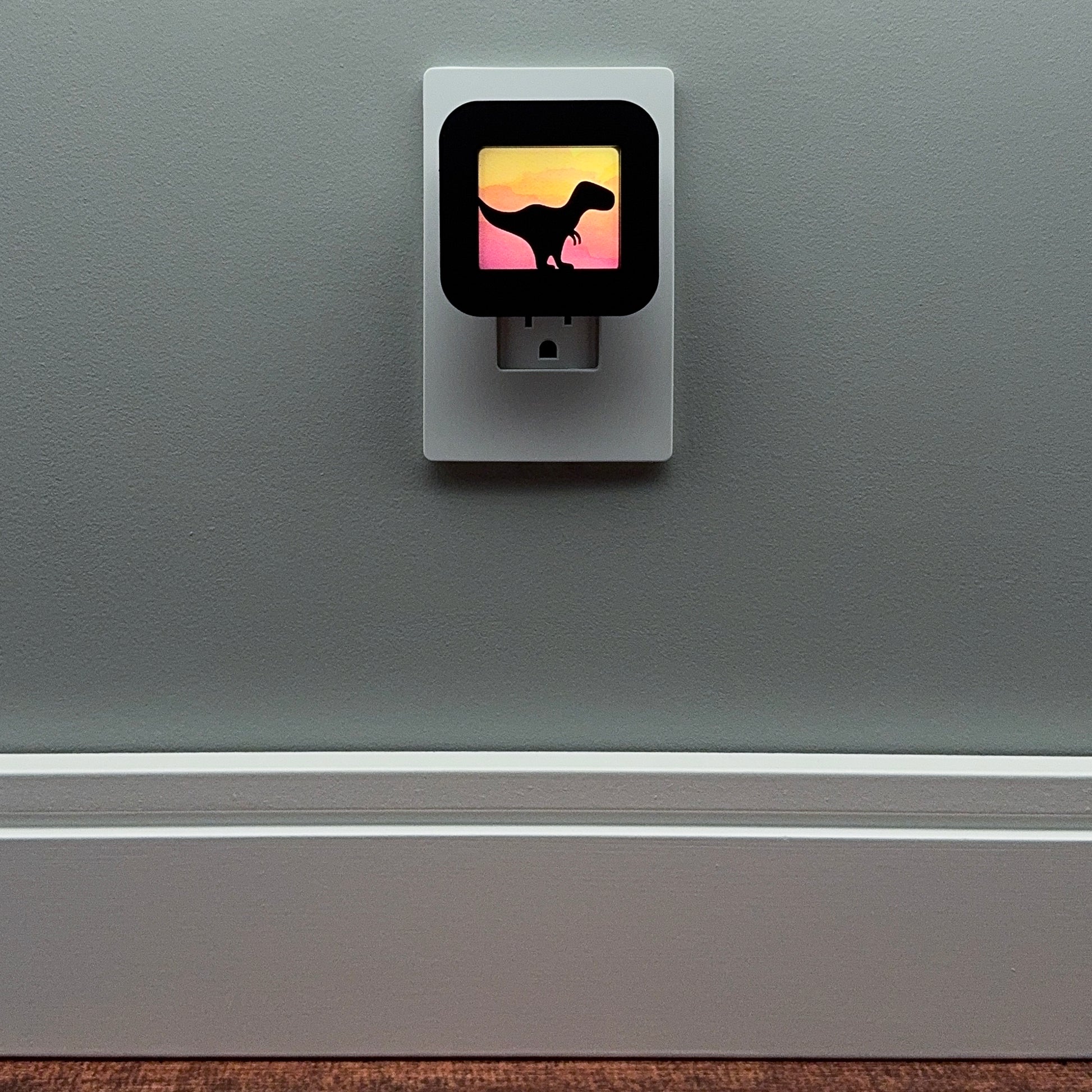 Illuminate your bathroom, hallway or kids bedroom with this colorful tyrannosaurus rex dinosaur night light! The laser cut cover slides easily over the included LED nightlight without interfering with the sensor or vents, and it automatically glows when the room darkens and stays cool to the touch.