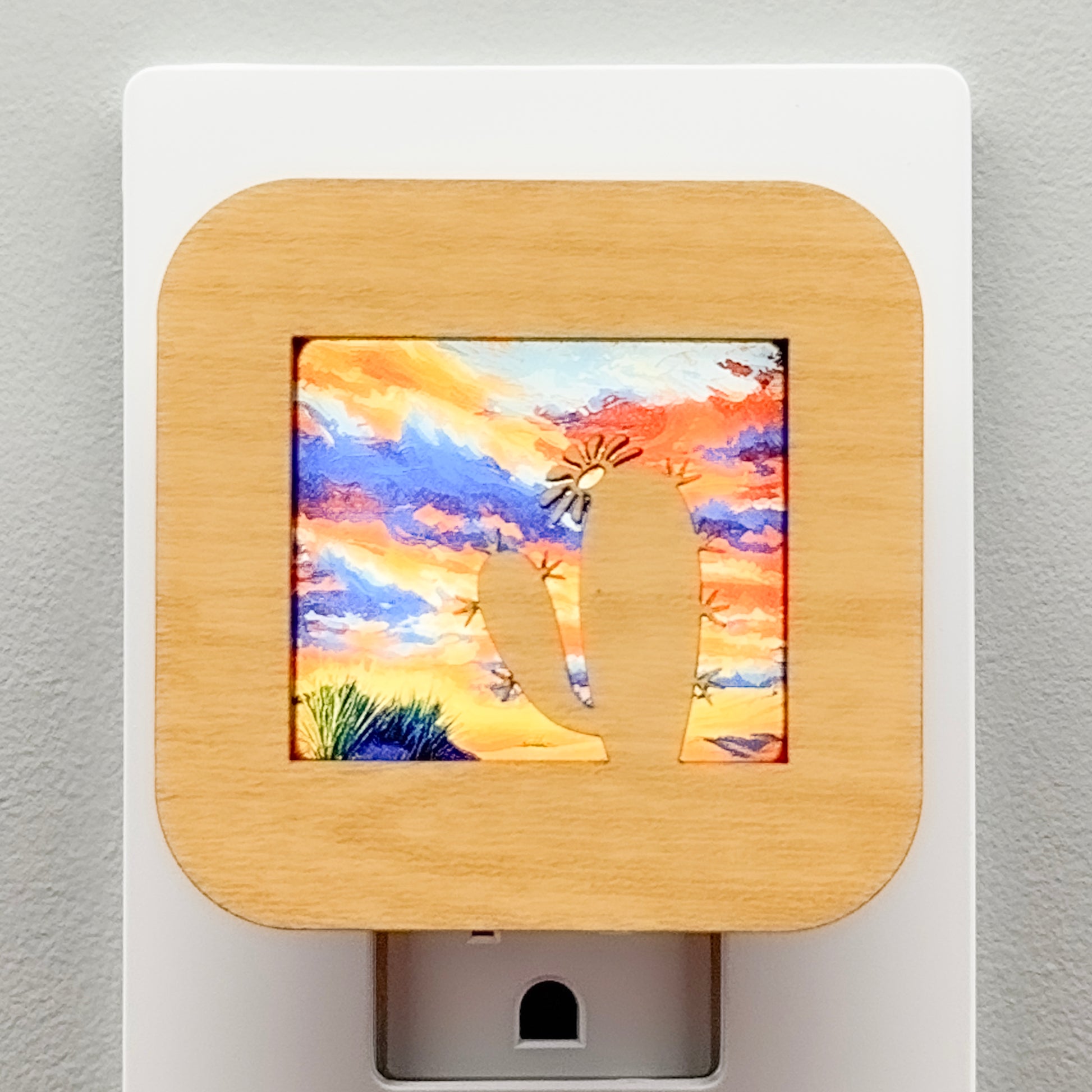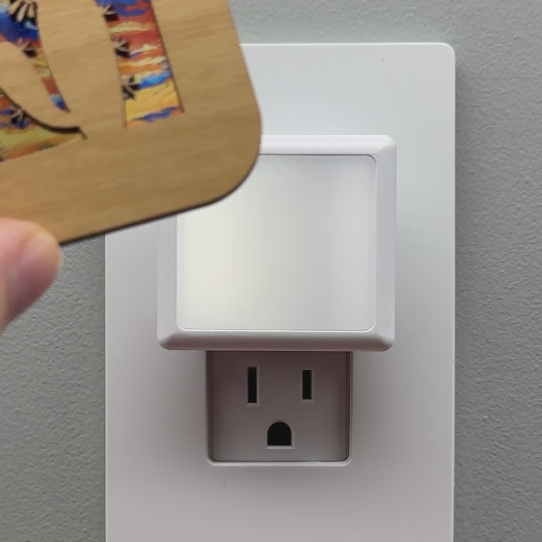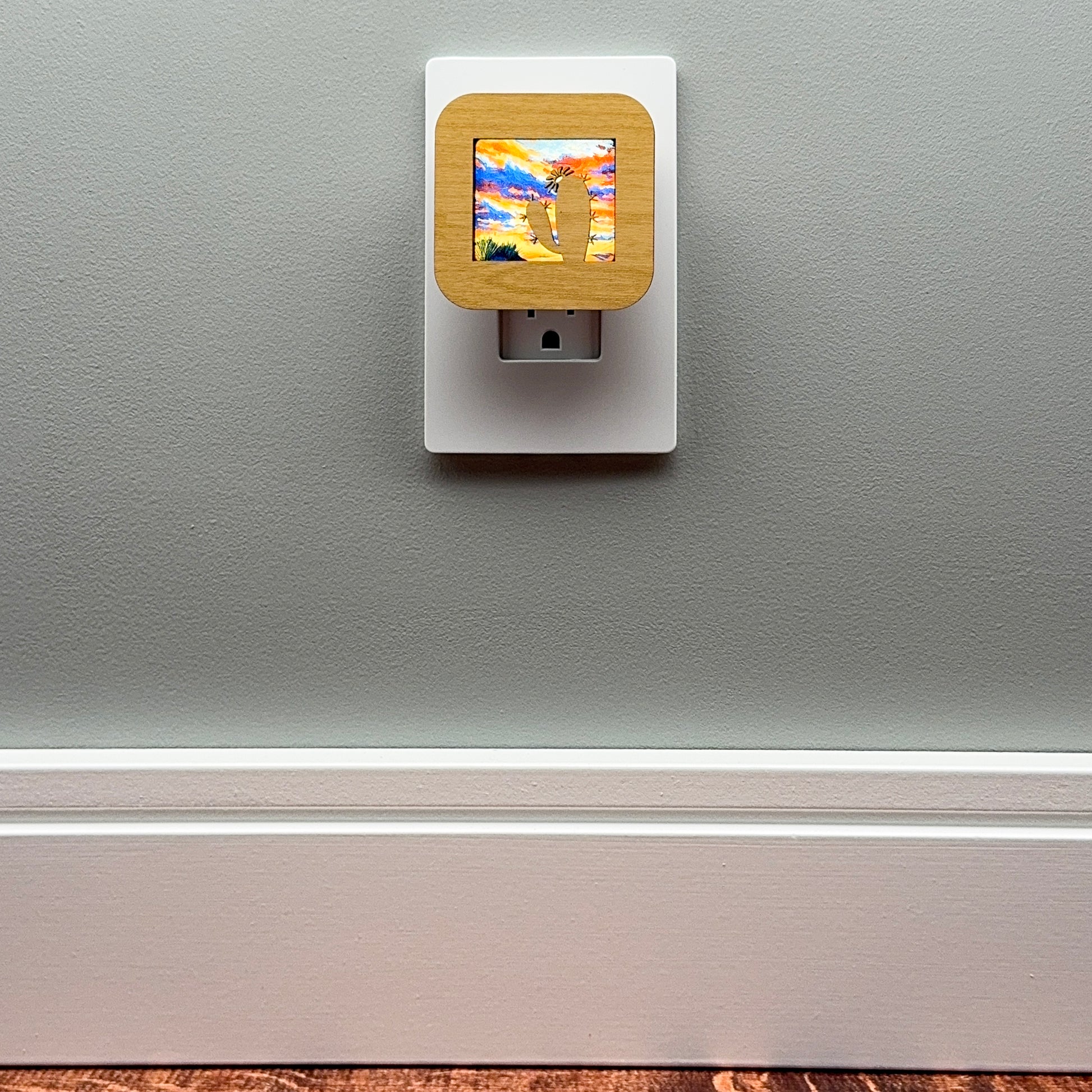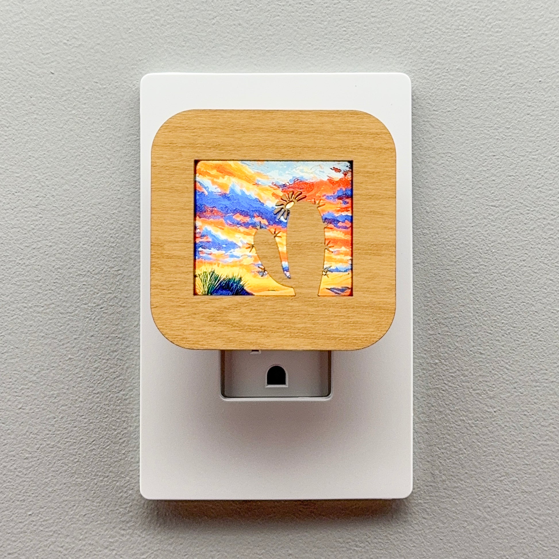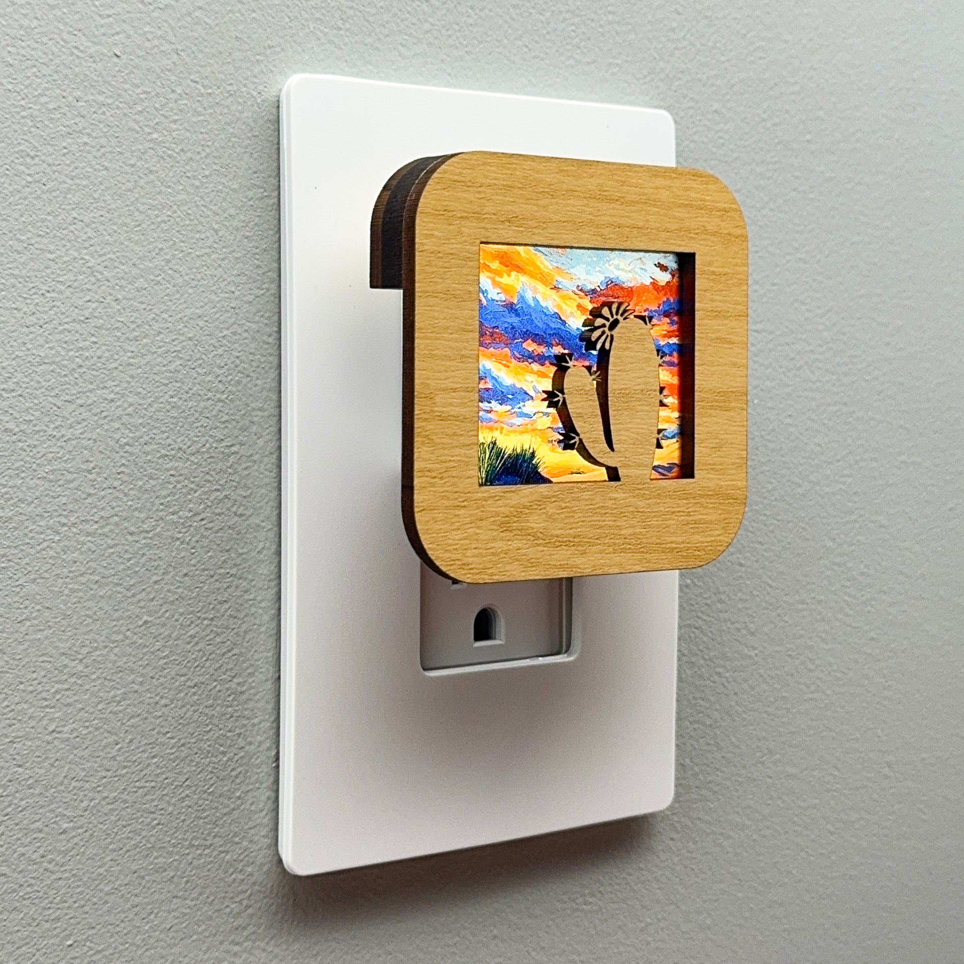 Illuminate your bathroom, hallway, or bedroom with this flowering cactus night light! The laser cut cover slides easily over the included LED nightlight without interfering with the sensor or vents, so it automatically glows when the room darkens and stays cool to the touch.