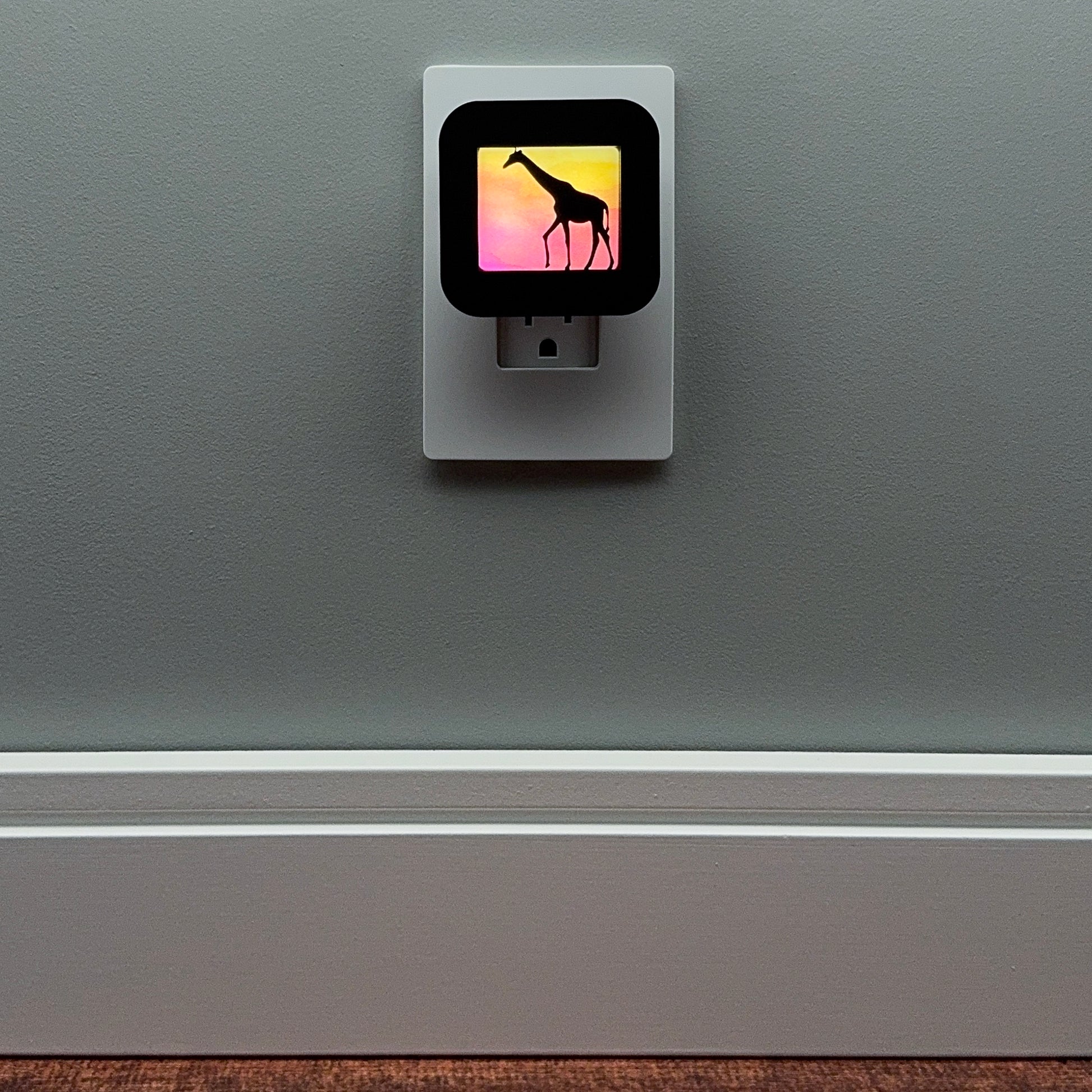 Illuminate your bathroom, hallway or bedroom with this giraffe at sunset night light! The laser cut cover slides easily over the included LED nightlight without interfering with the sensor or vents, so it automatically glows when the room darkens and stays cool to the touch.