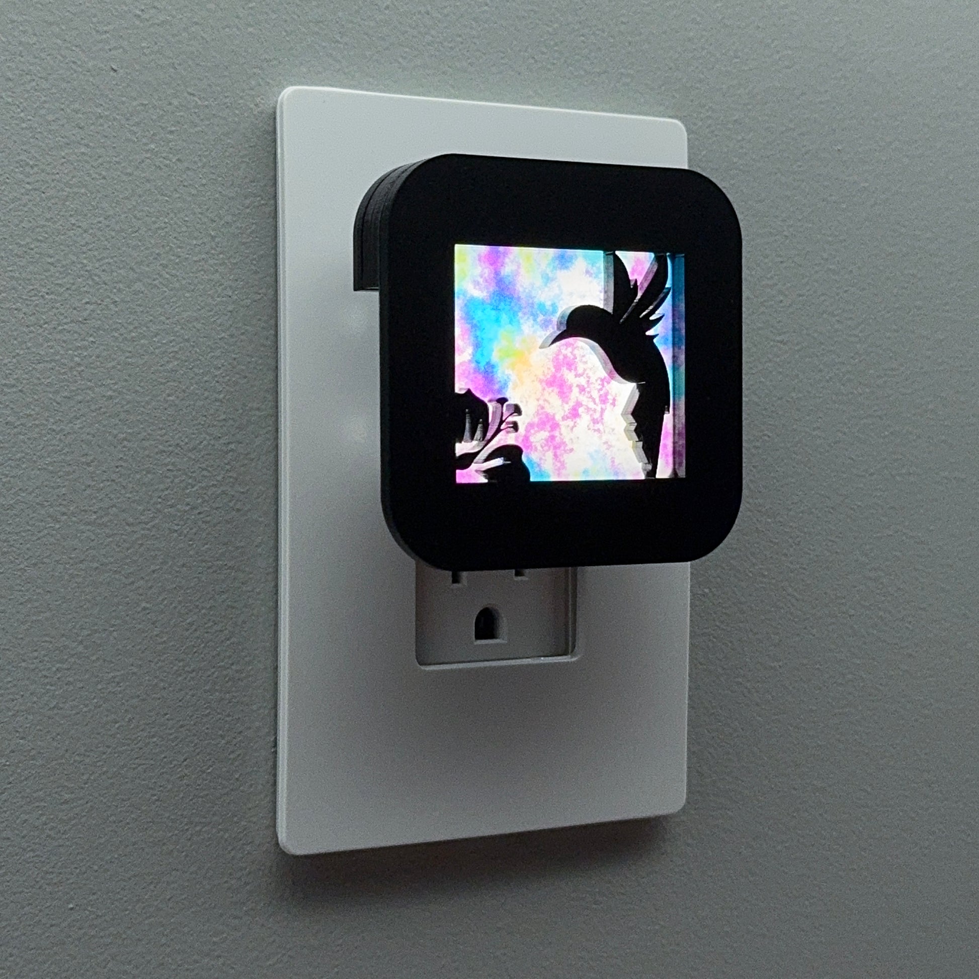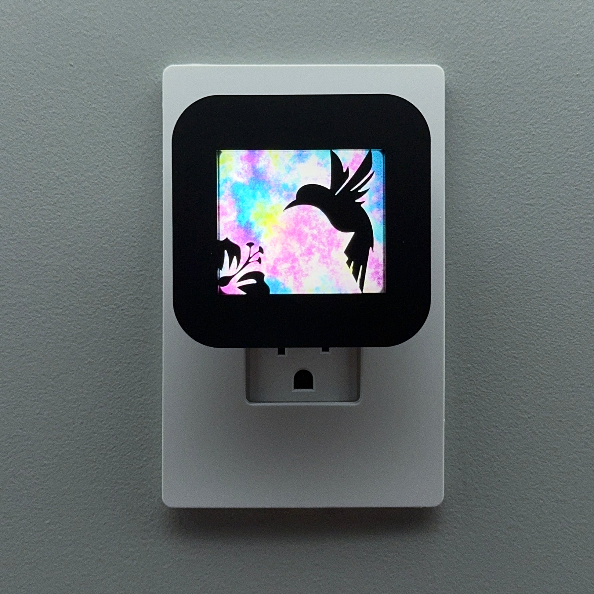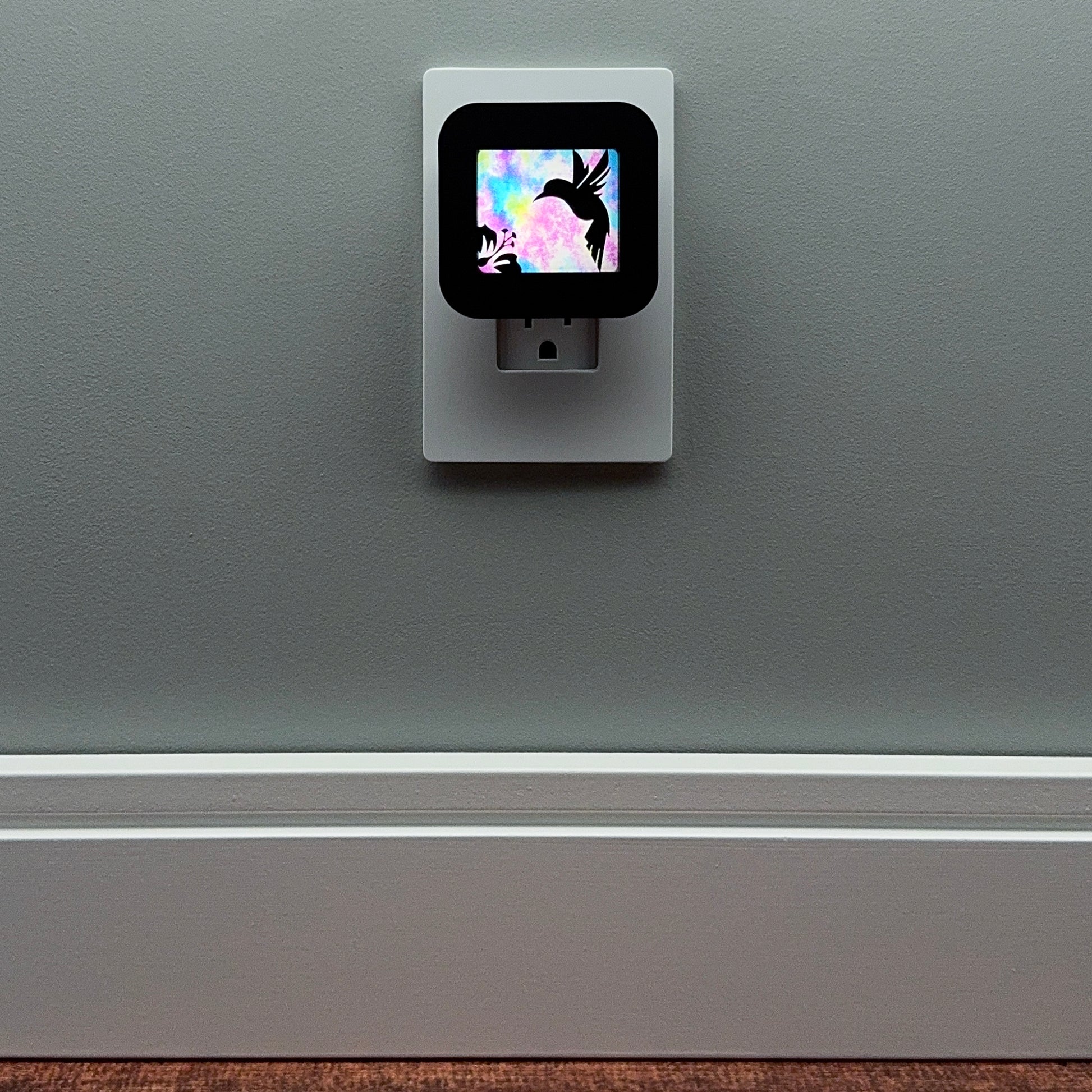 Illuminate your bathroom, hallway or bedroom with this beautiful hummingbird night light! The laser cut cover slides easily over the included LED nightlight without interfering with the sensor or vents, so it automatically glows when the room darkens and stays cool to the touch.