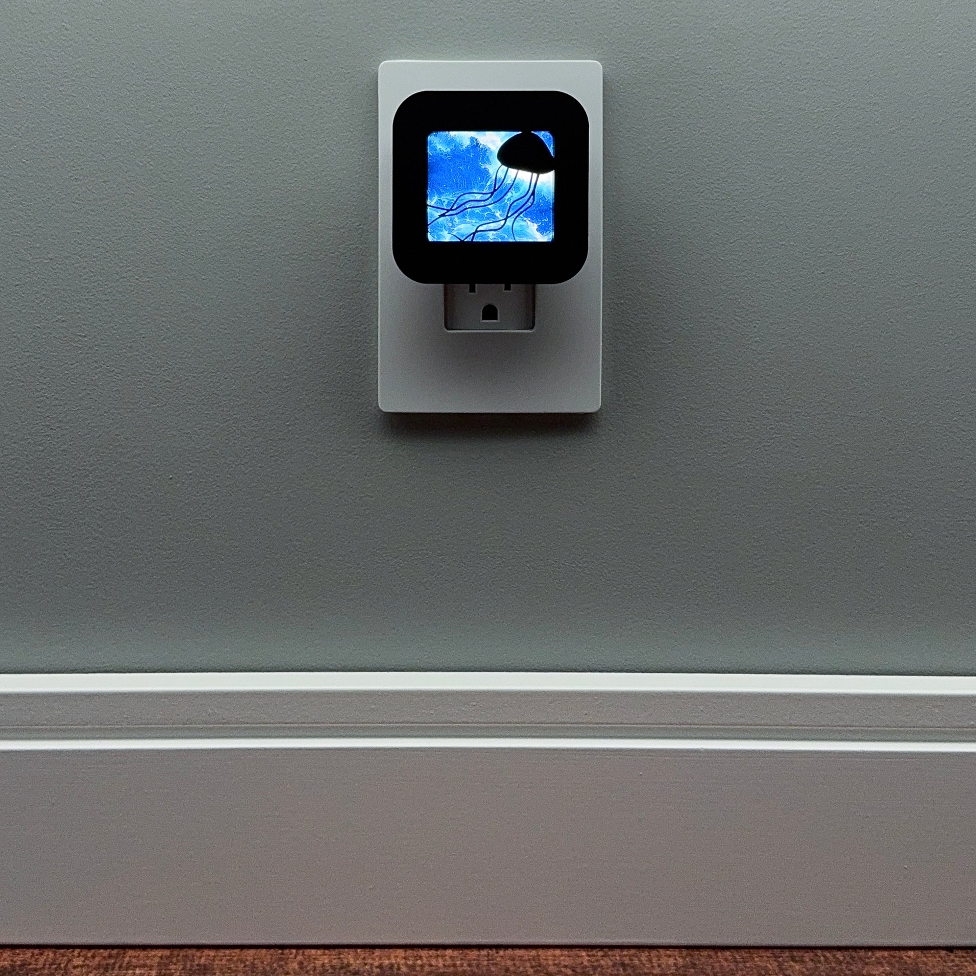 Illuminate your bathroom, hallway or bedroom with this beautiful jellyfish night light! The laser cut cover slides easily over the included LED nightlight without interfering with the sensor or vents, so it automatically glows when the room darkens and stays cool to the touch.
