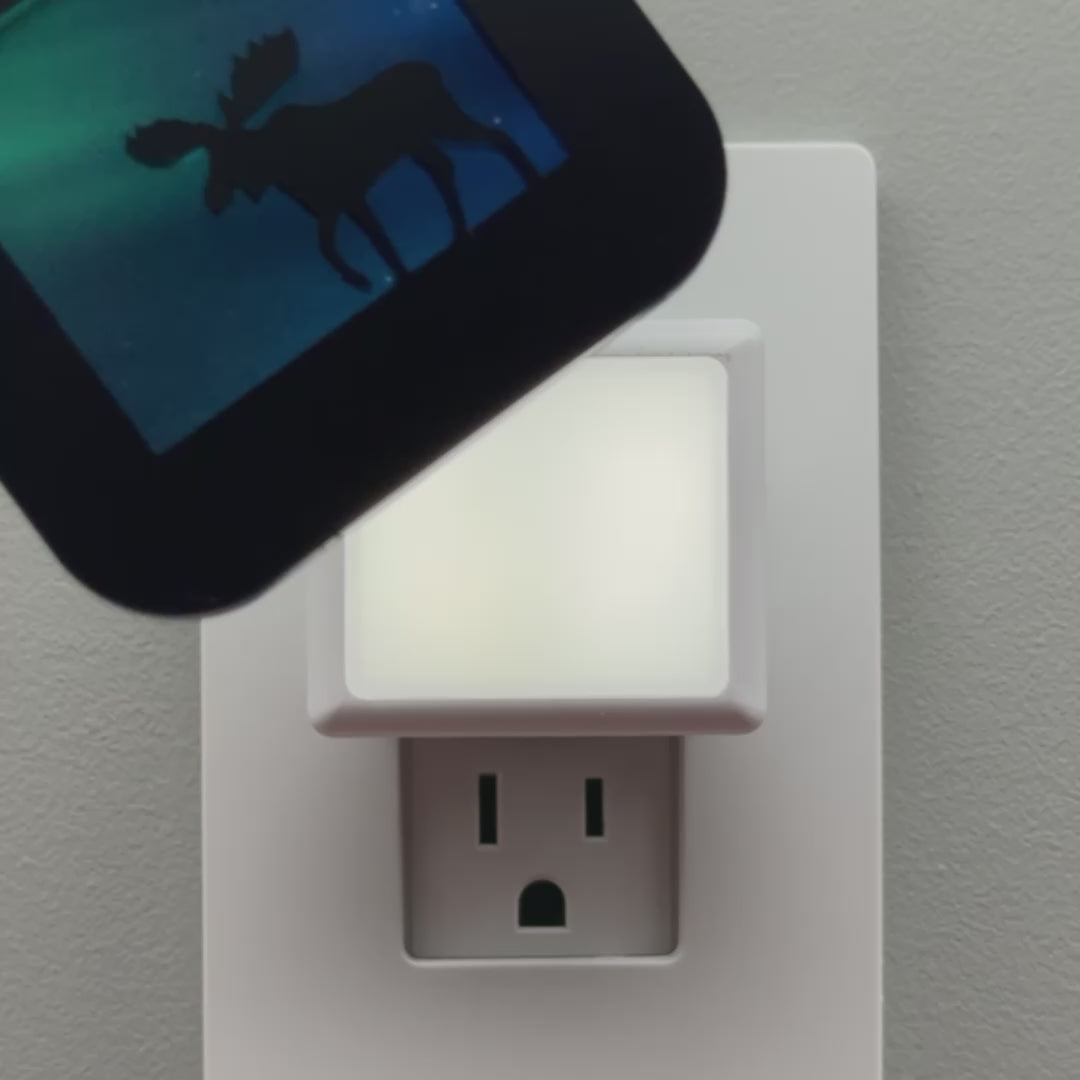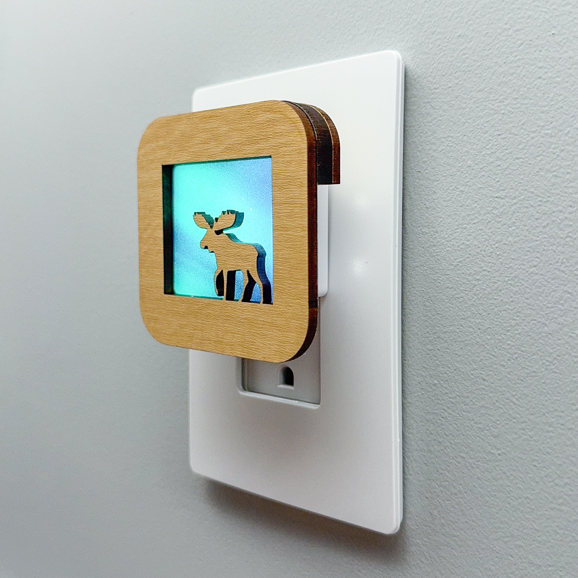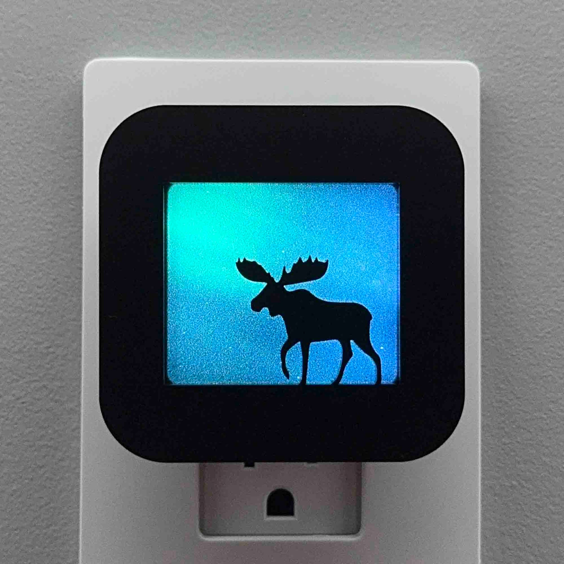 Illuminate your bathroom, hallway or bedroom with this beautiful moose Northern Lights night light! The laser cut cover slides easily over the included LED nightlight without interfering with the sensor or vents, so it automatically glows when the room darkens and stays cool to the touch.
