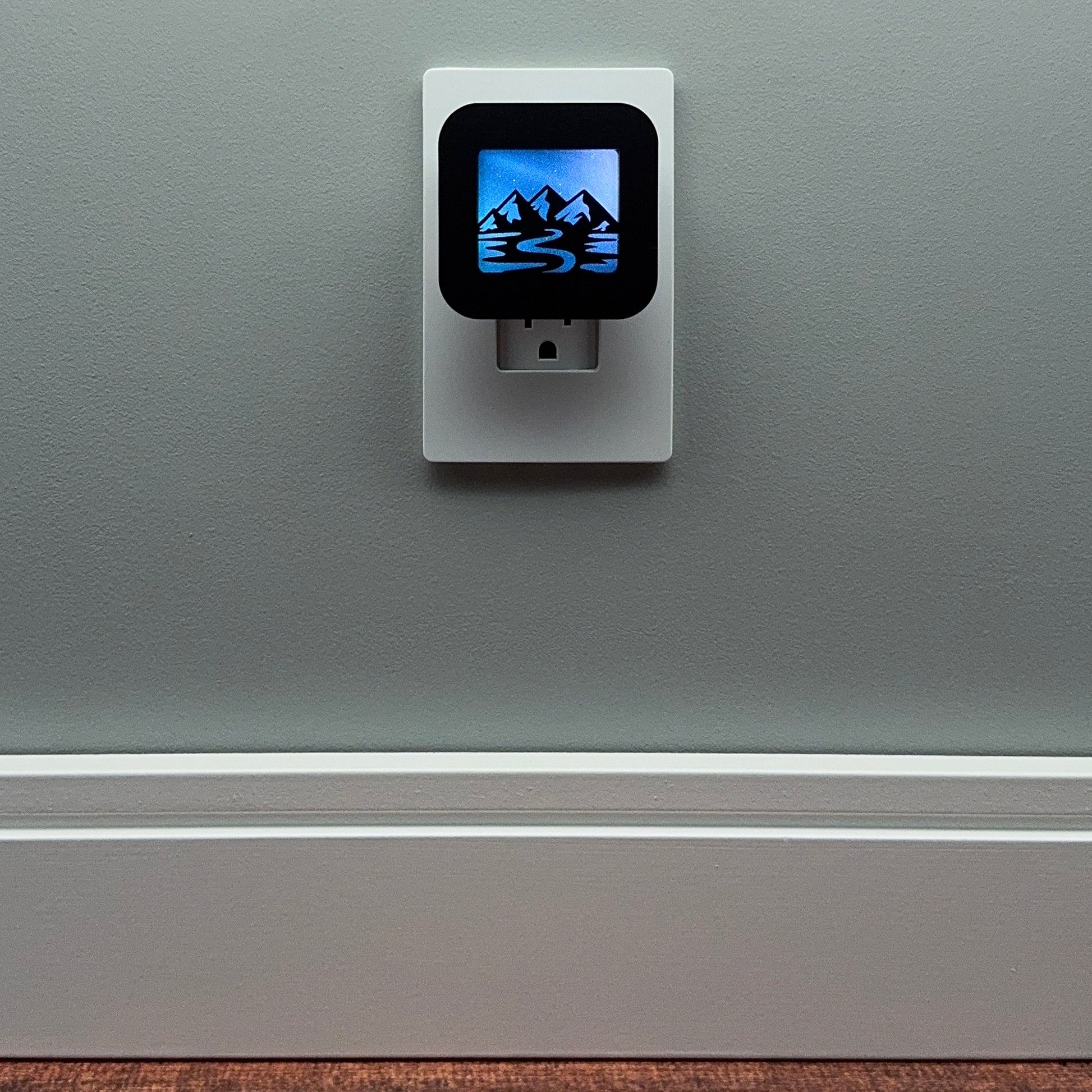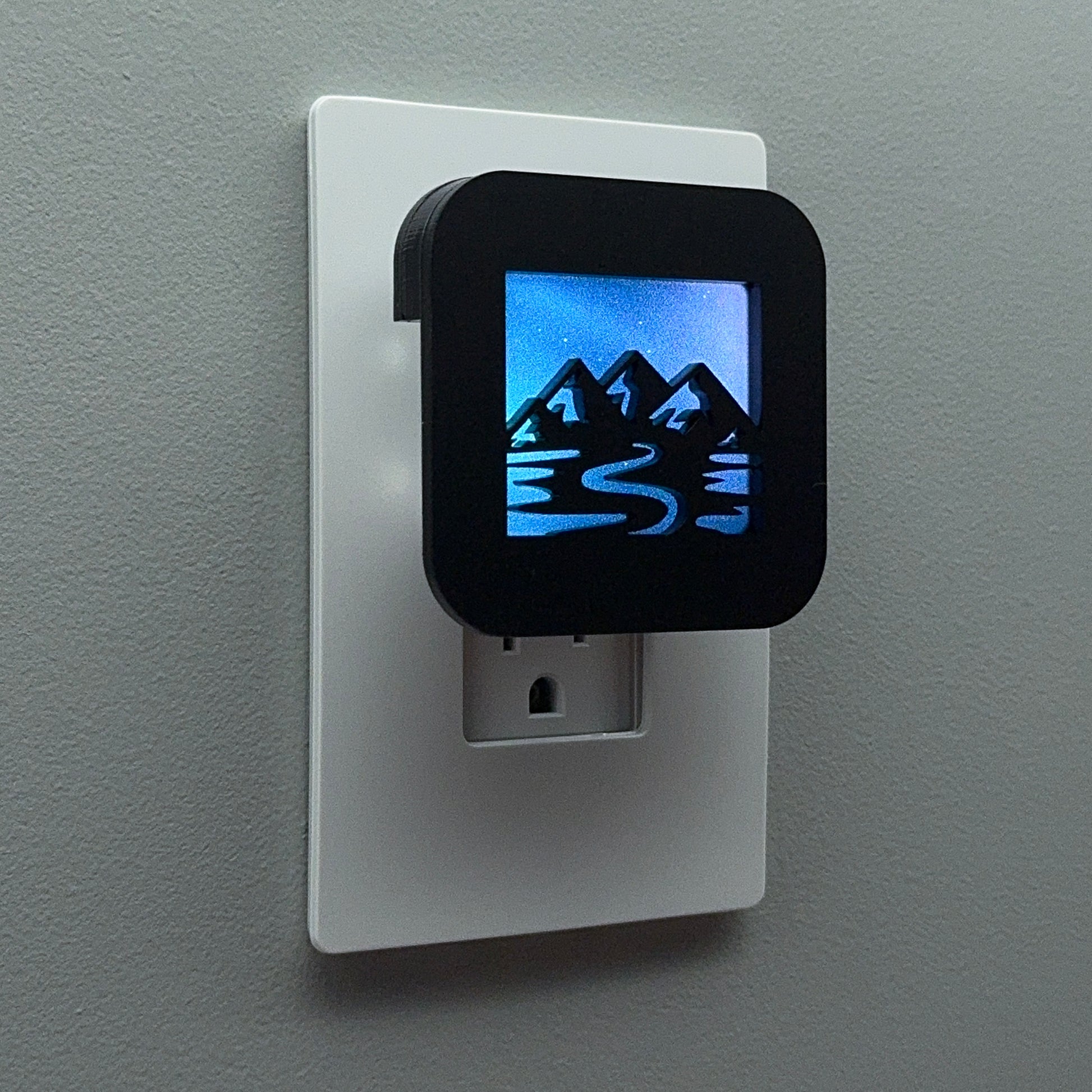 Experience the quiet majesty of the wilderness with this beautiful plug-in night light, featuring a striking silhouette of rugged mountain peaks behind a winding river.