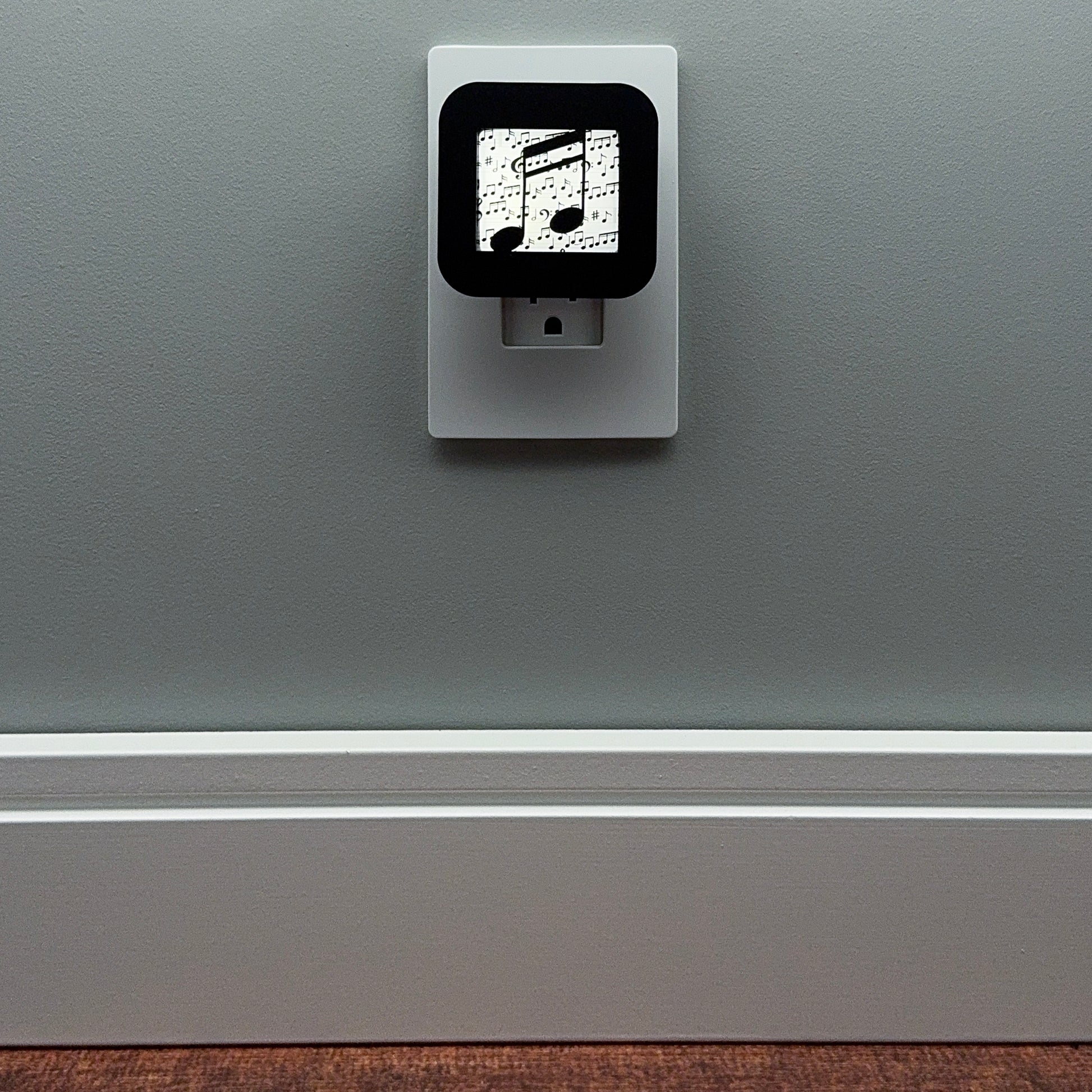 Hit the high notes of decor with this plug-in night light, featuring a bold double music note silhouette set against a crisp background patterned with sheet music.