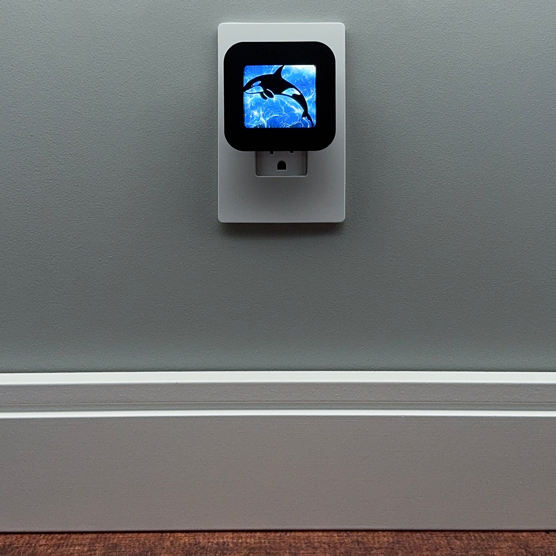 Bring the majesty of the sea indoors with this striking plug-in night light, featuring a orca whale silhouette leaping above a deep blue and white water background.