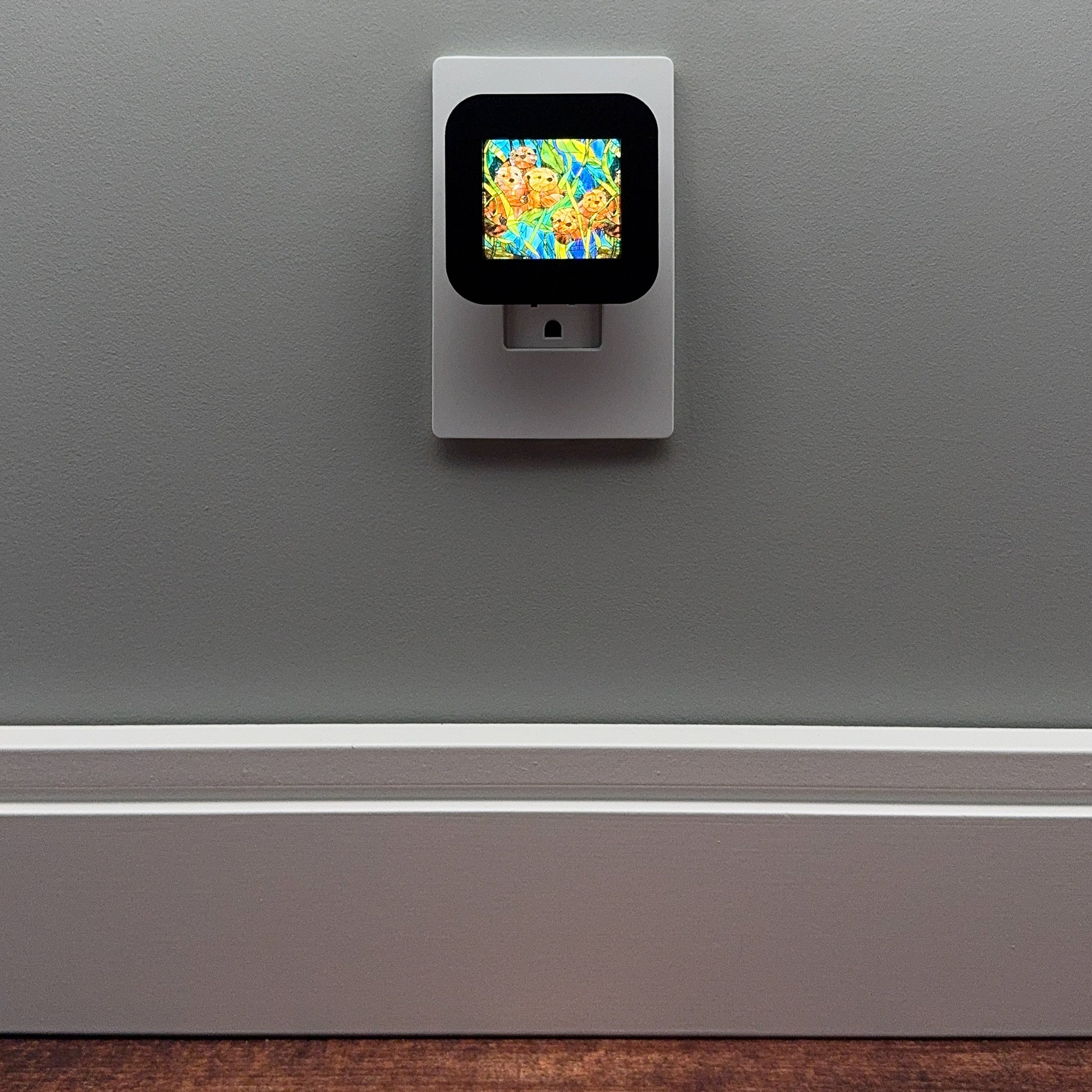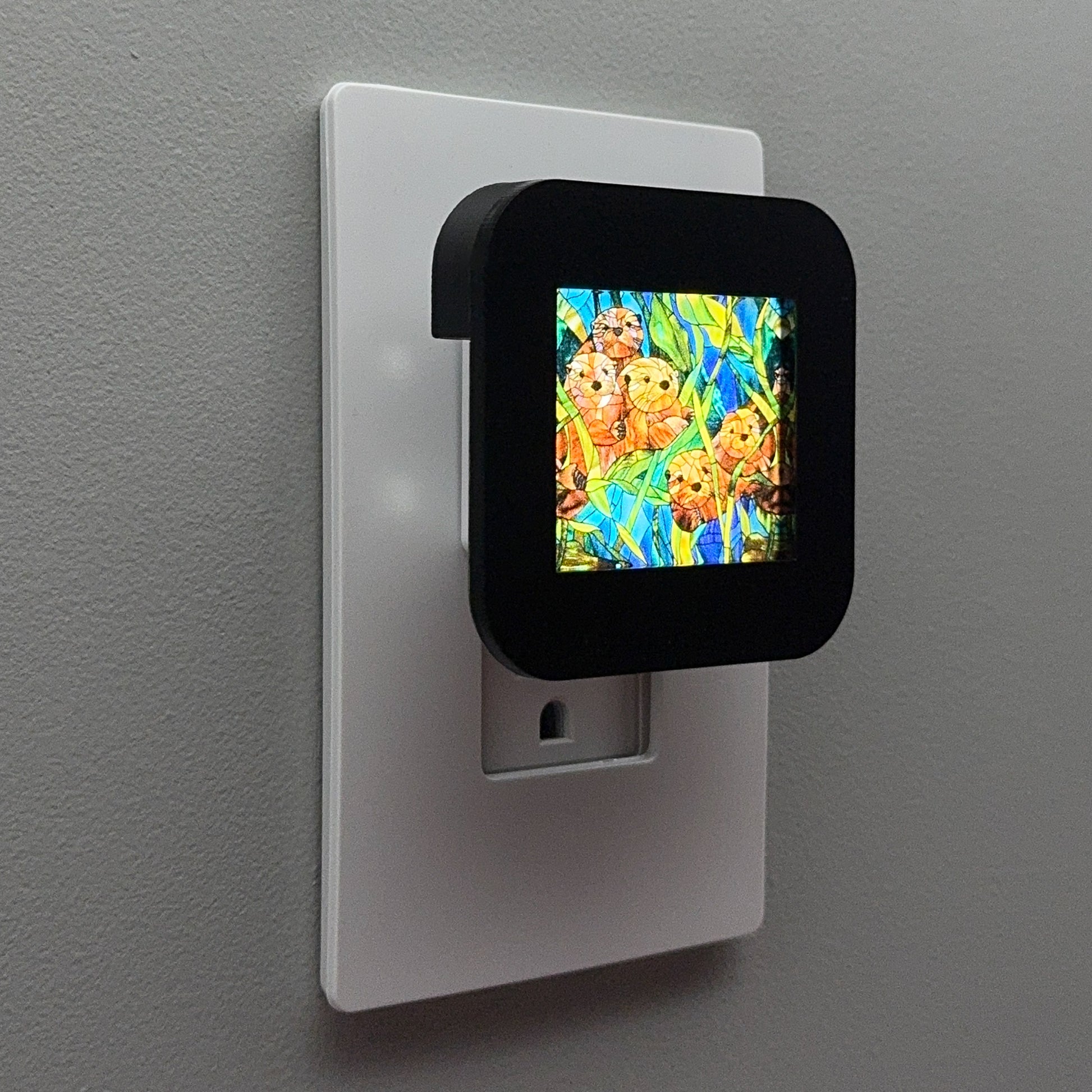 Bring these playful otters into your home with this delightful plug-in night light, featuring a group of adorable river otters rendered in a faux stained glass pattern.