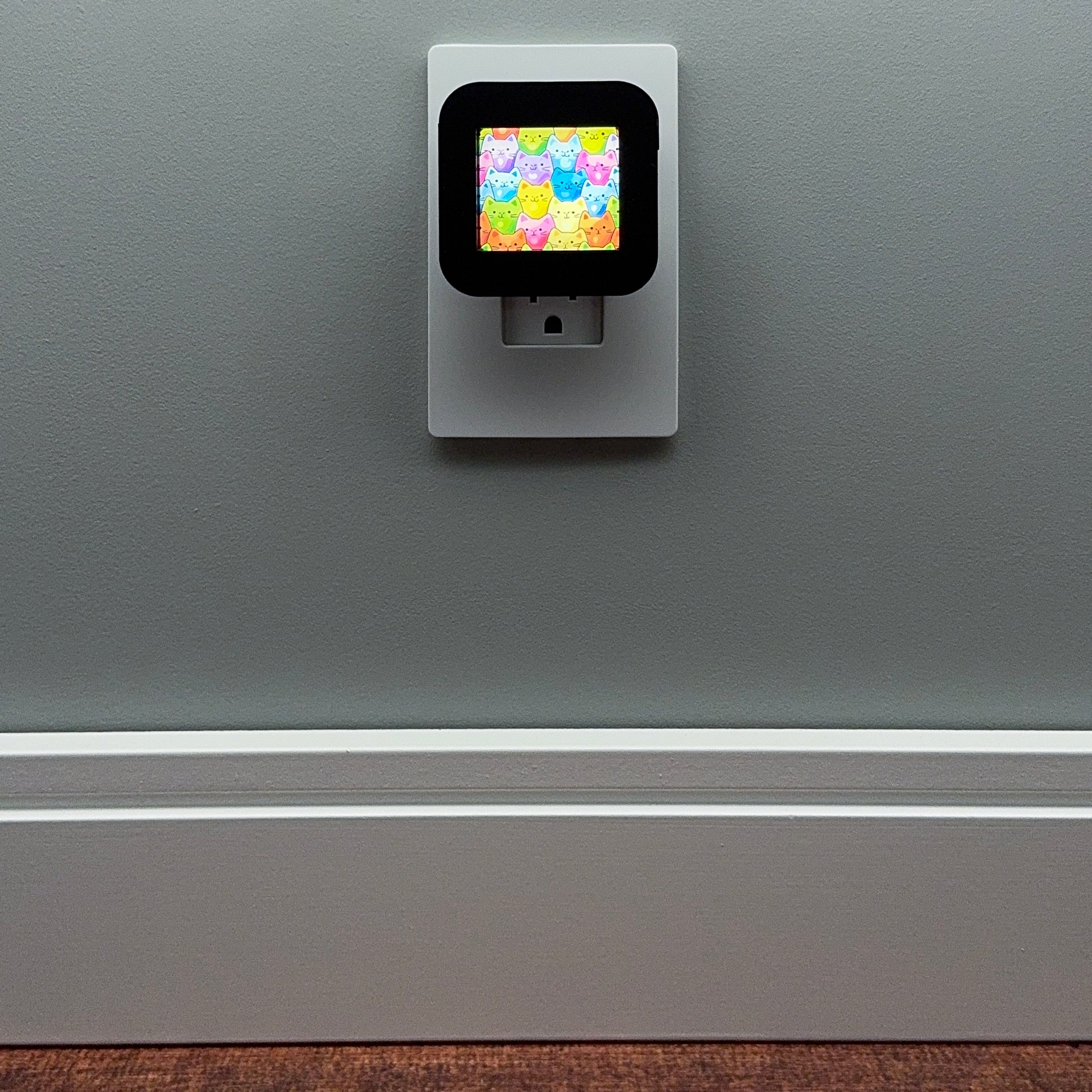 Add a massive dose of color and cuteness to any room with this cheerful plug-in night light, featuring a delightful pattern of adorable kitten faces in every shade of the rainbow.