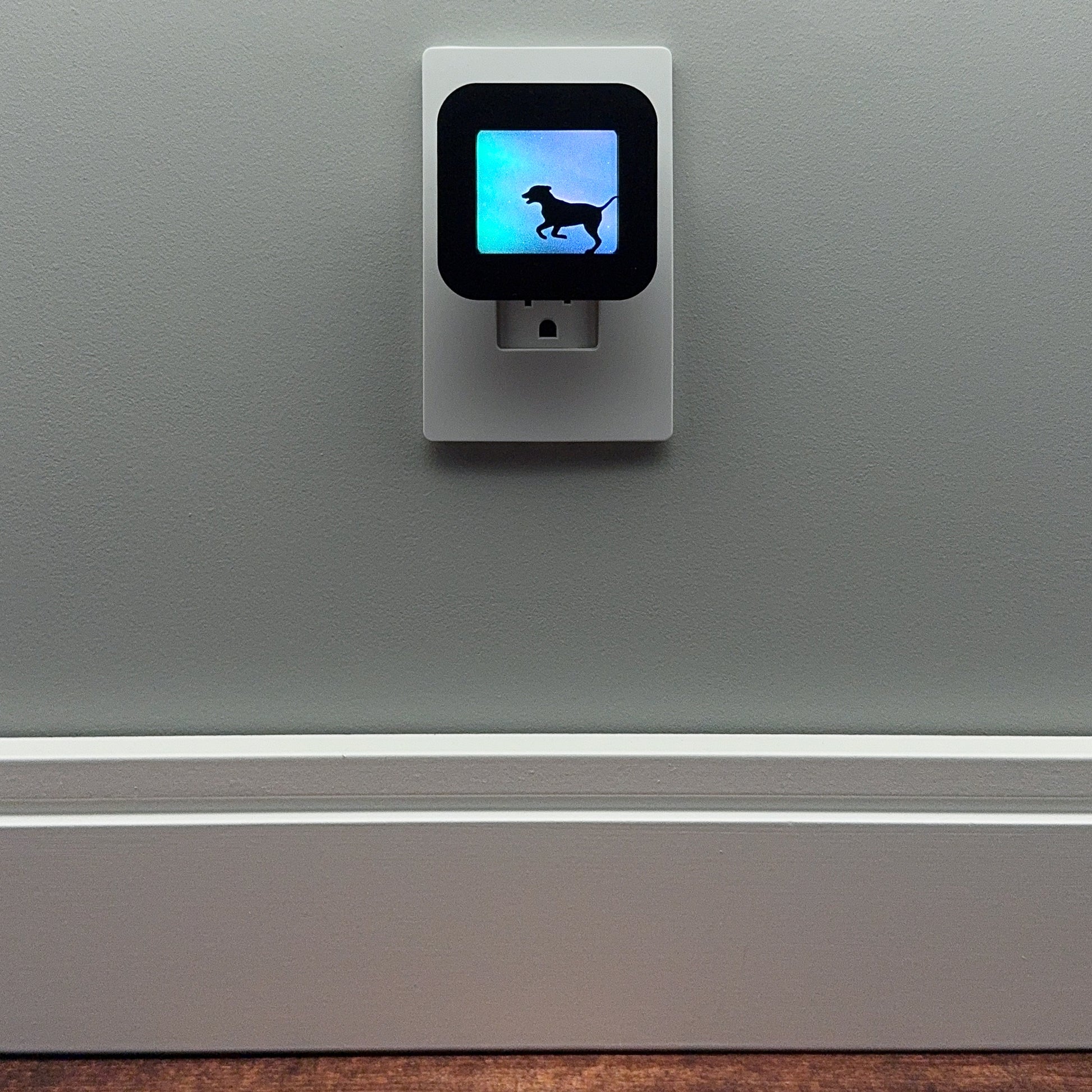 Show off your love of all things canine with this lovely plug-in night light, featuring the silhouette of a dog running in front of a beautiful Northern Lights sky.