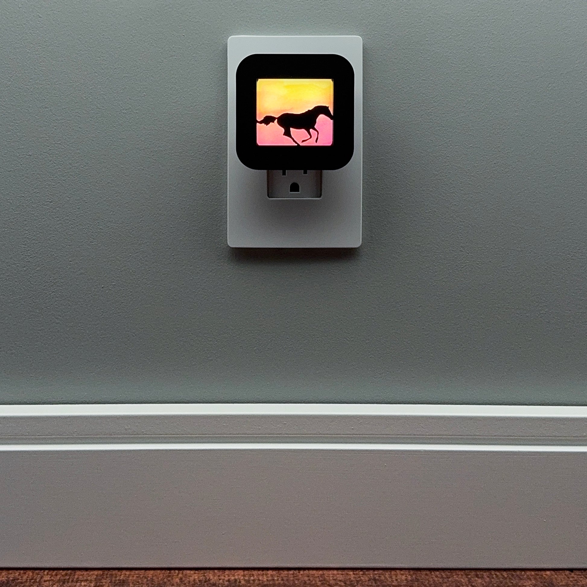 Illuminate your bathroom, hallway or bedroom with this beautiful running horse at sunset night light! The laser cut cover slides easily over the included LED nightlight without interfering with the sensor or vents, so it automatically glows when the room darkens and stays cool to the touch.