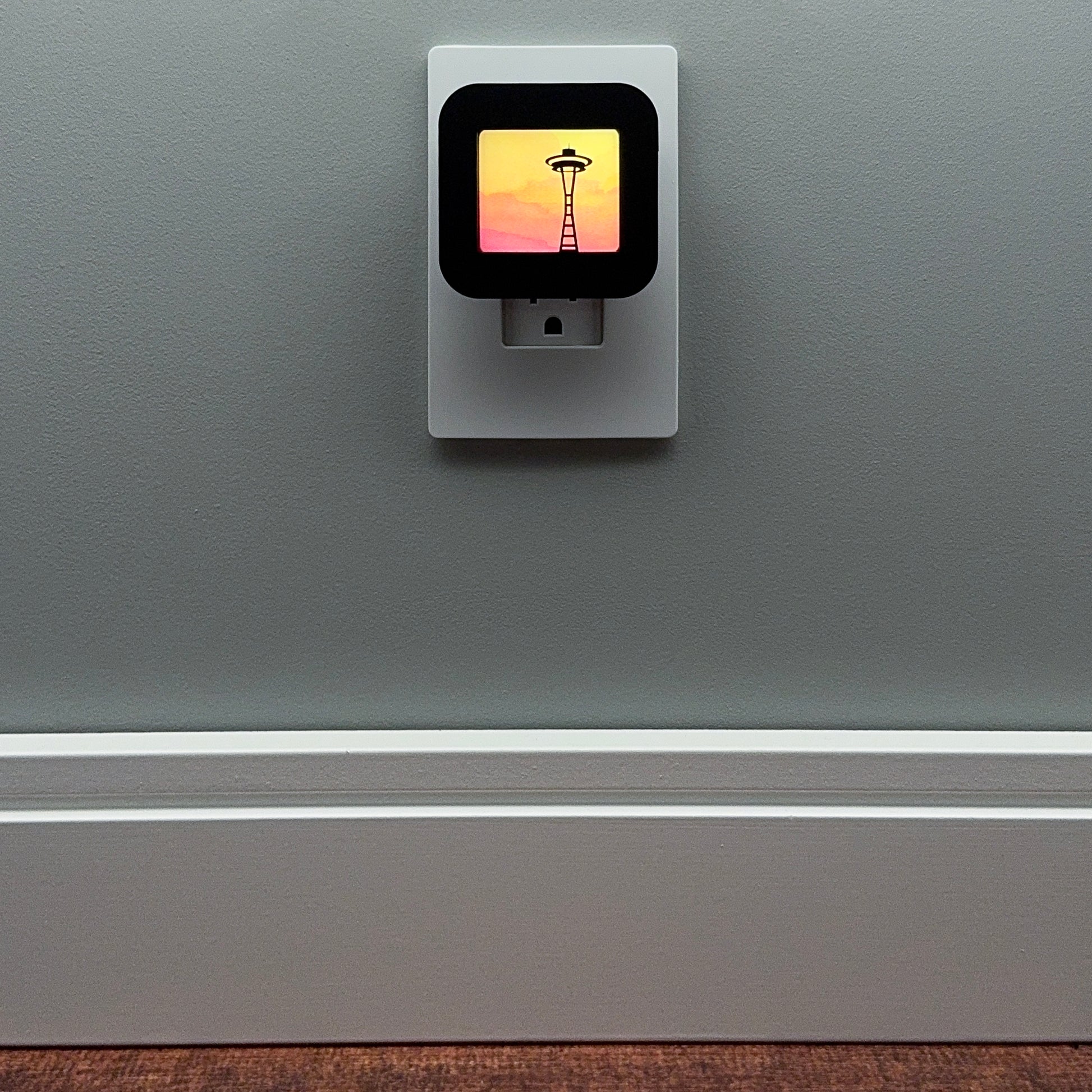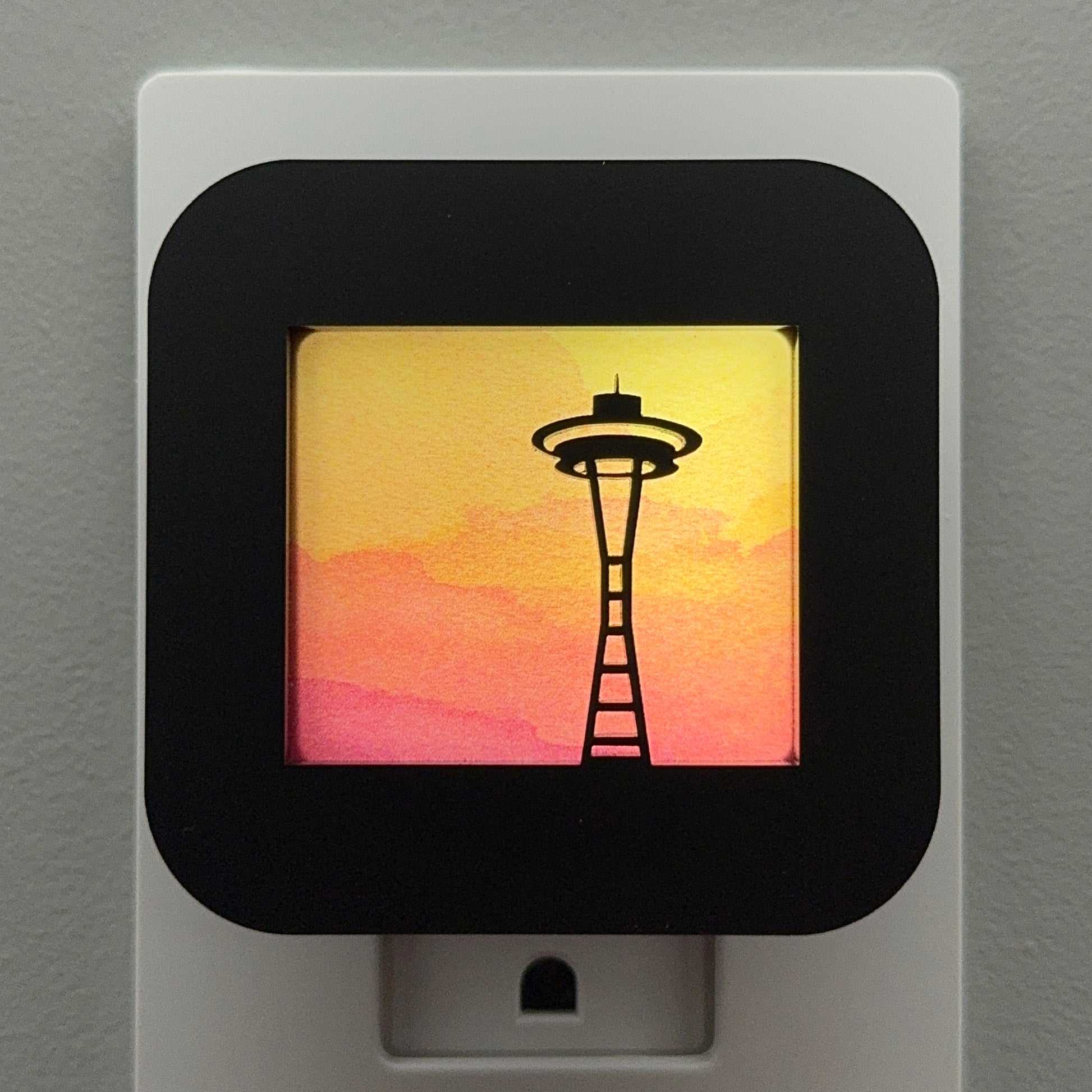 Celebrate your love for the Emerald City with this colorful plug-in night light, featuring the iconic Seattle Space Needle silhouette set against a vibrant, watercolor sunset background.