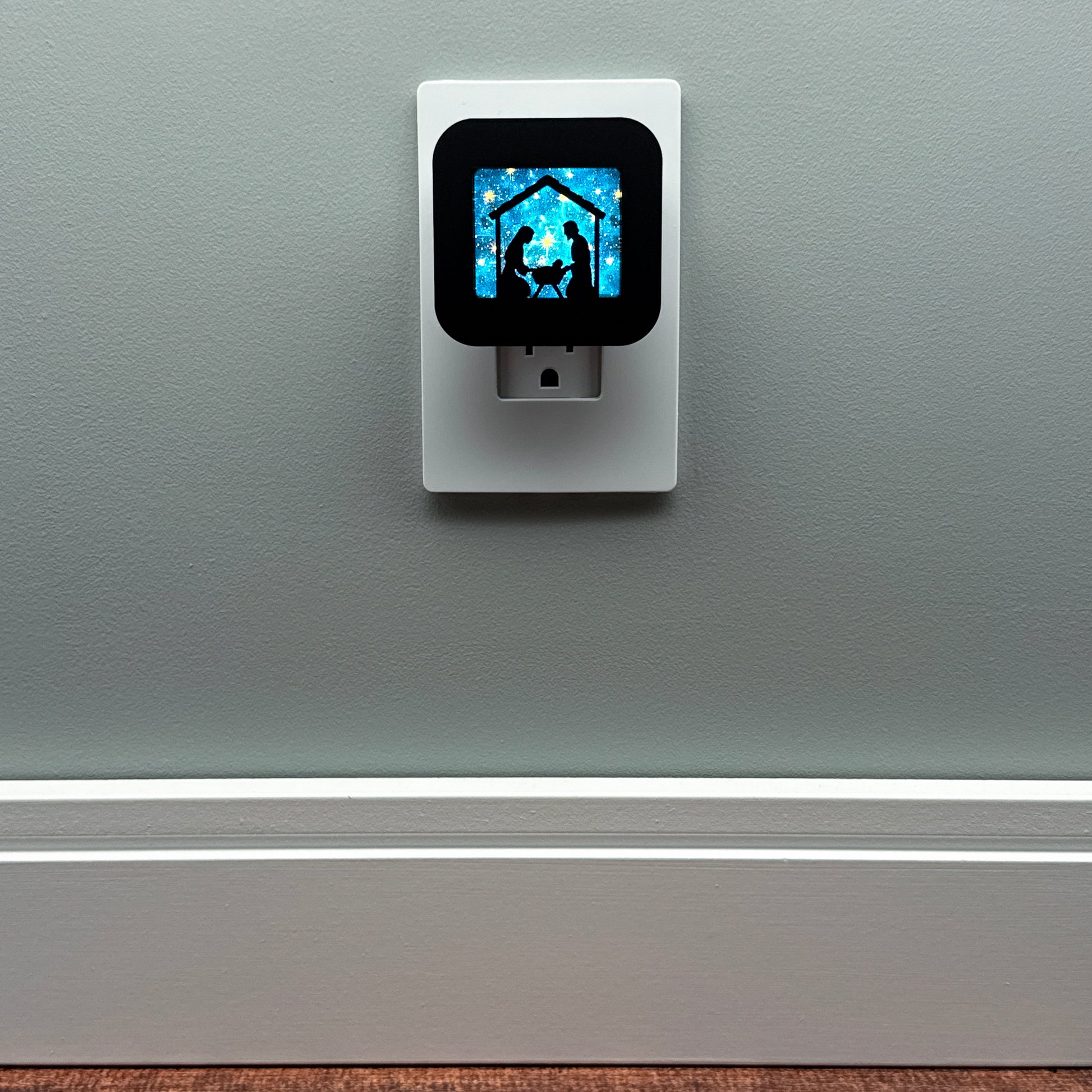 Commemorate the true meaning of Christmas with this beautiful night light, featuring a serene nativity scene silhouette beneath a starry, luminous sky.