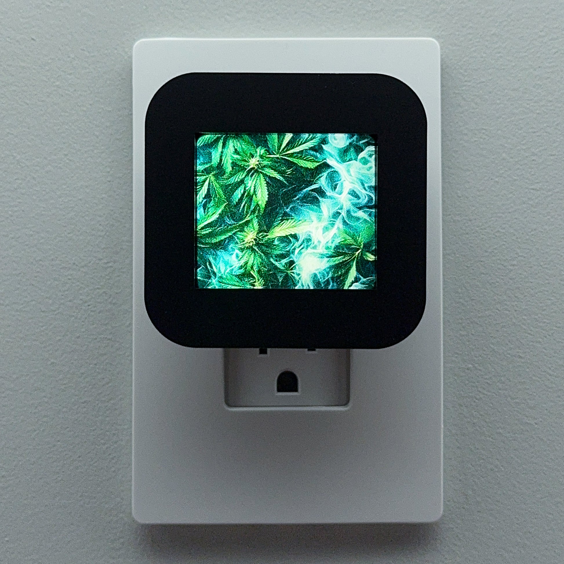 Add a unique, groovy vibe to your space with this distinctive plug-in night light, featuring marijuana leaves interwoven with subtle plumes of smoke.