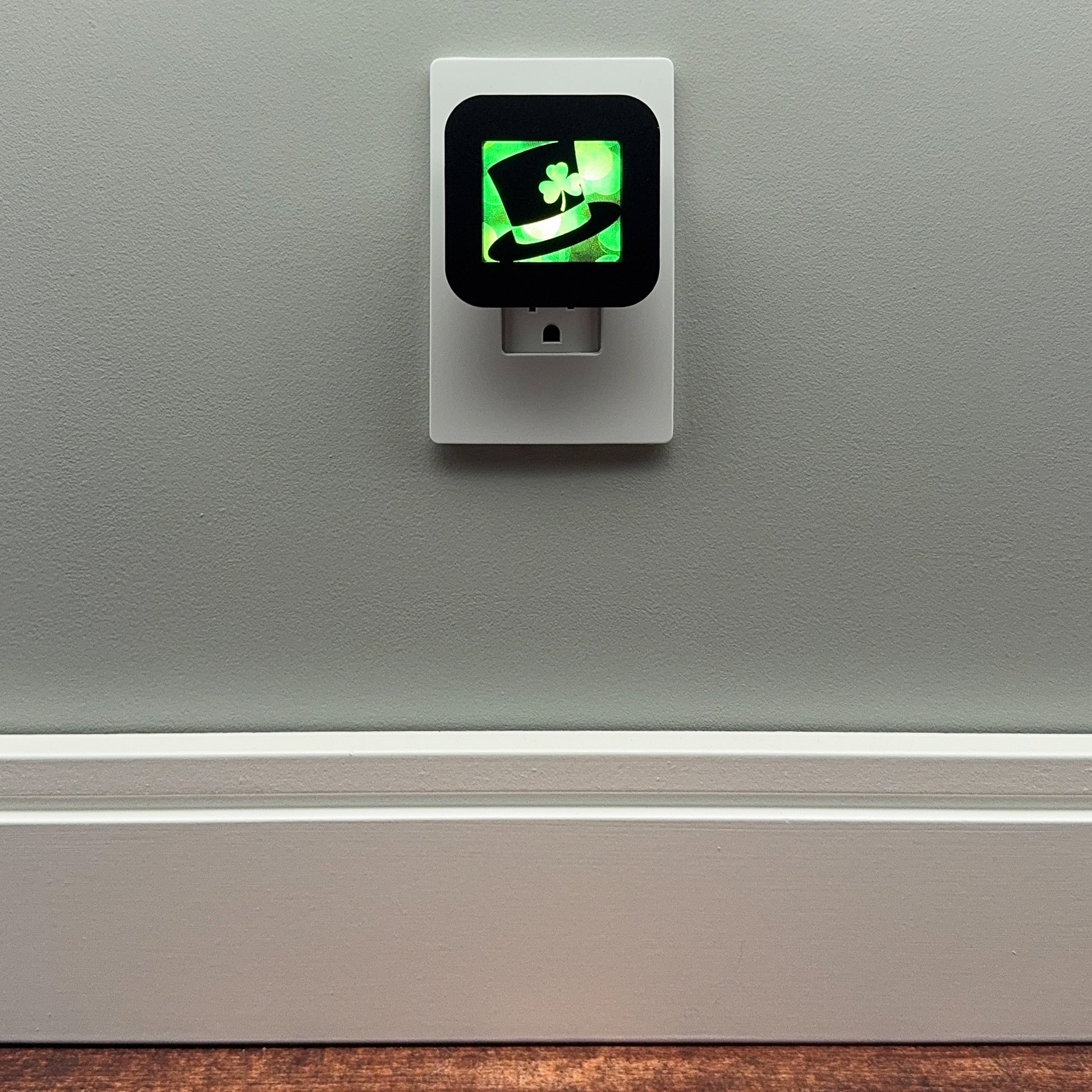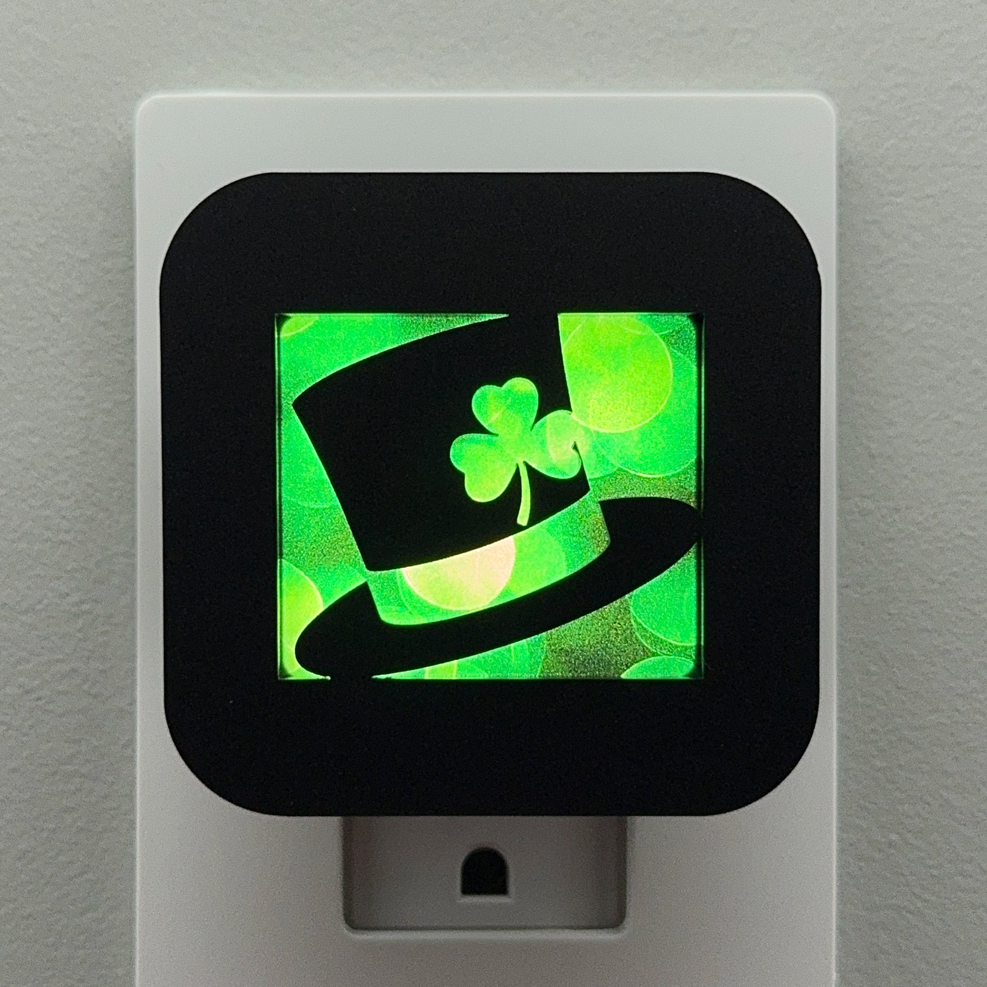 Add a touch of luck and whimsy to your space with this playful plug-in night light, featuring the bold silhouette of a leprechaun’s hat complete with a shamrock set against a vibrant green background.