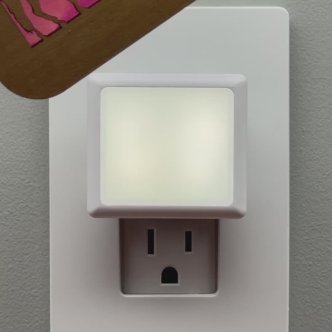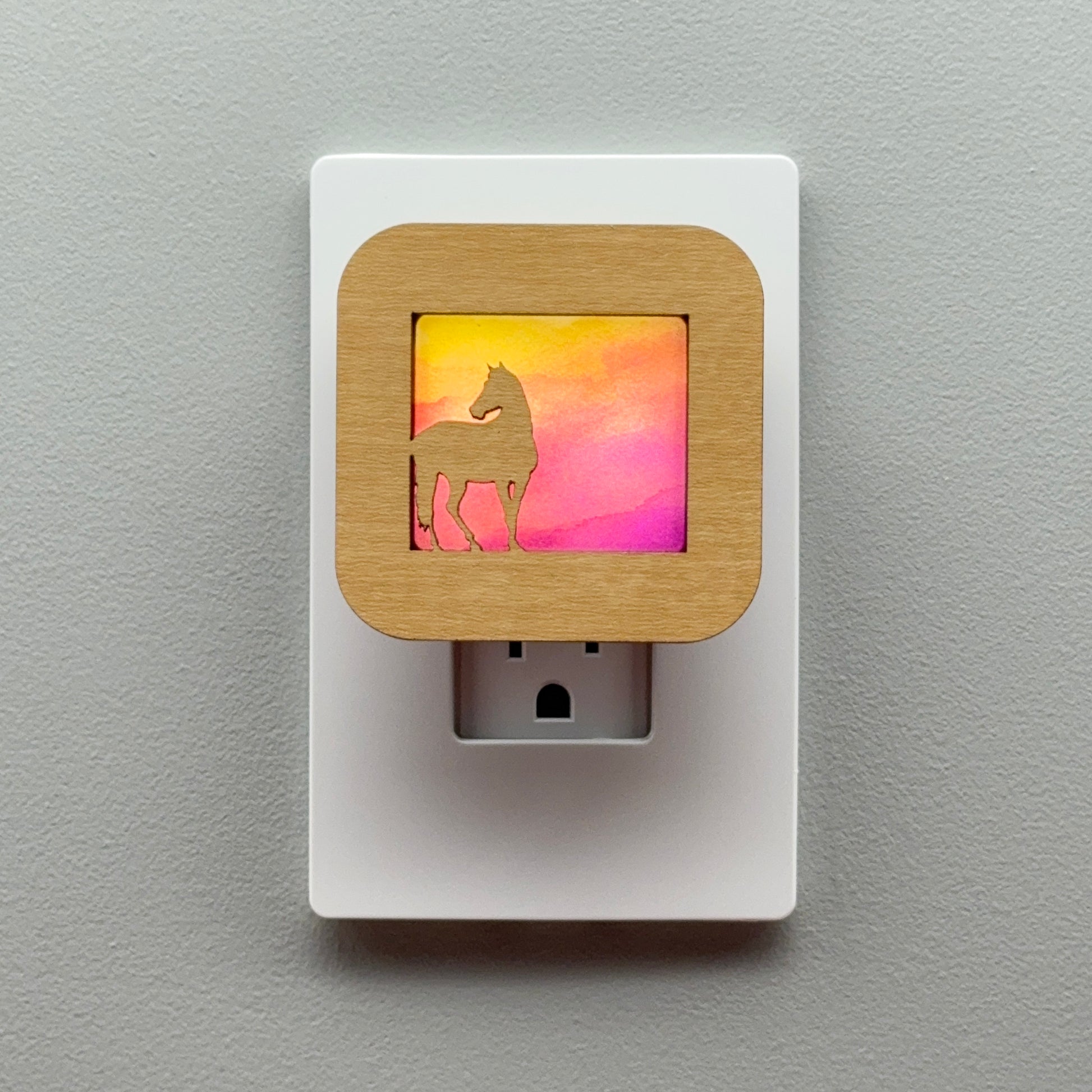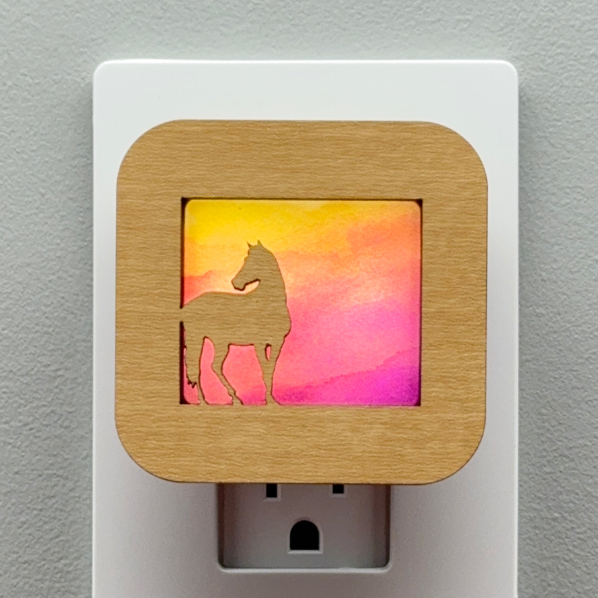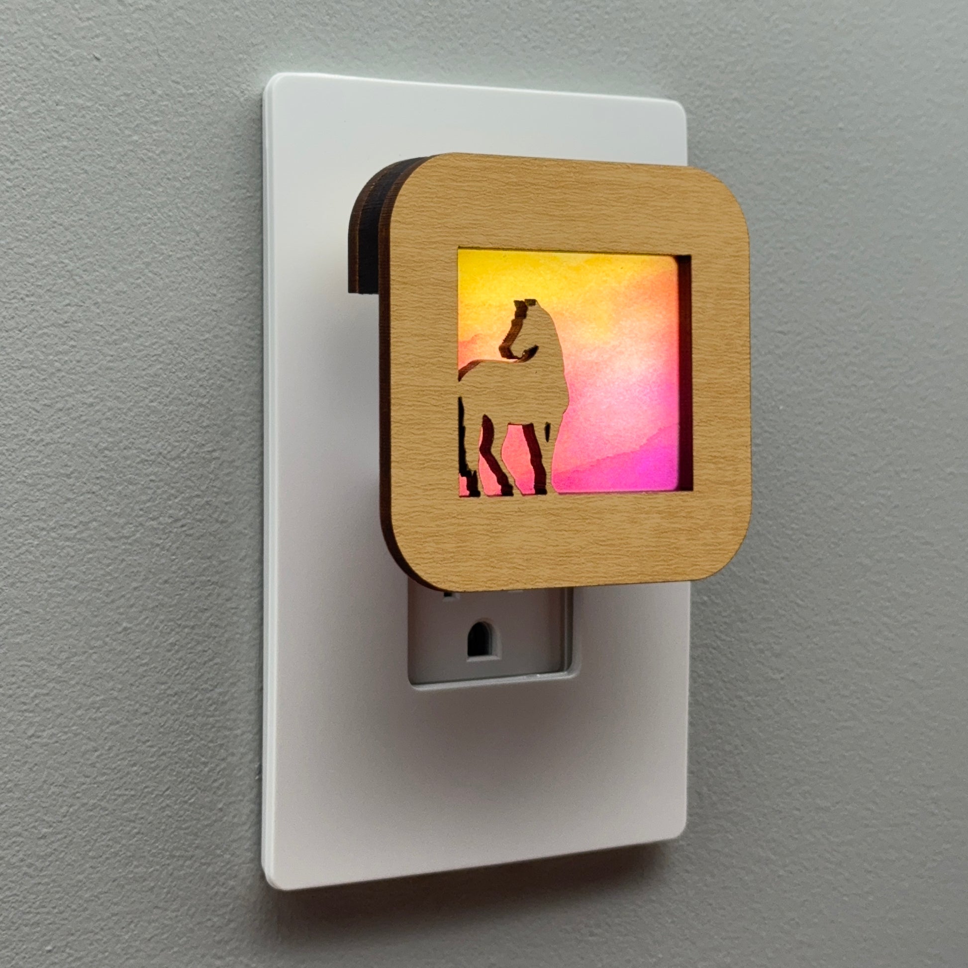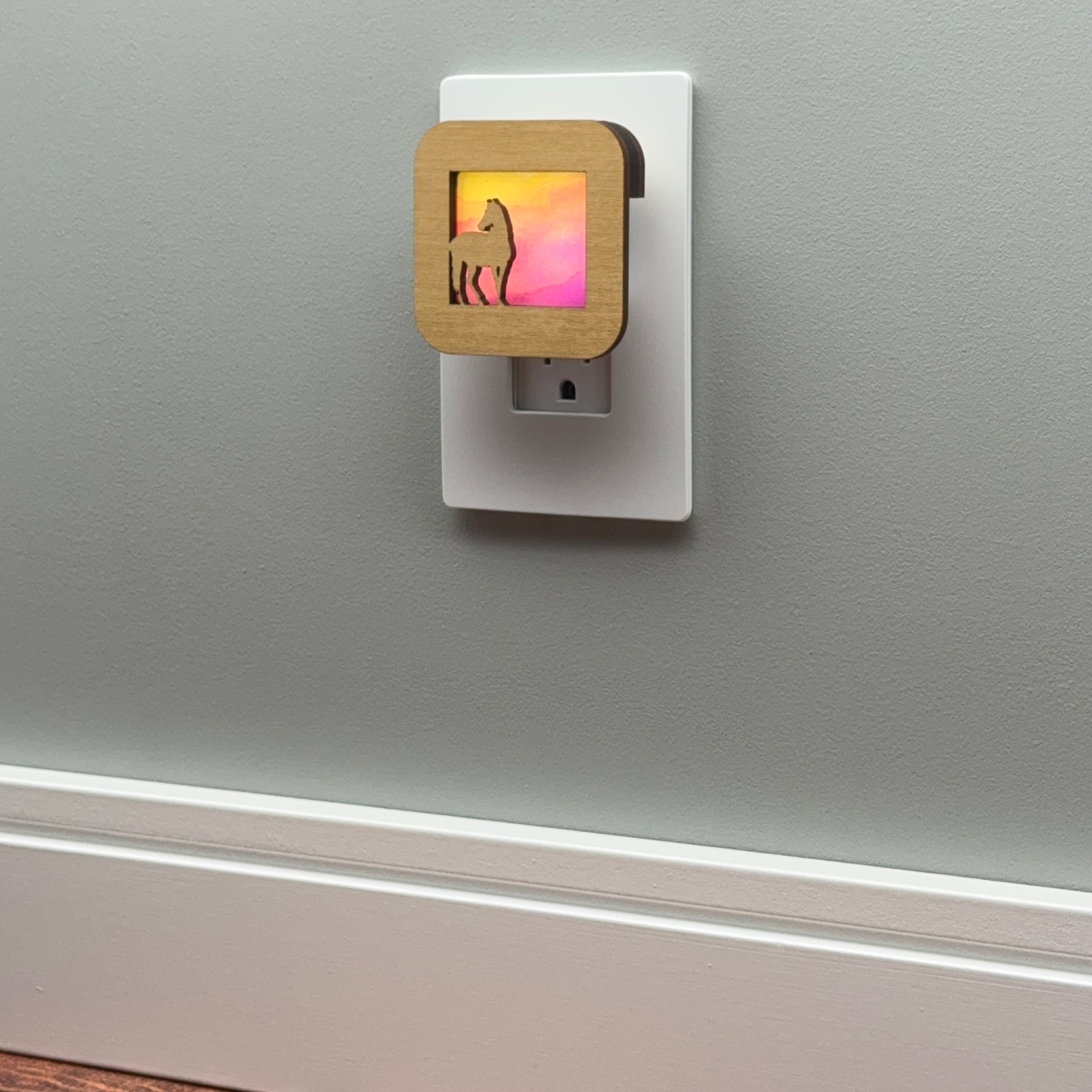 Illuminate your bathroom, hallway or bedroom with this beautiful horse at sunset night light! The laser cut cover slides easily over the included LED nightlight without interfering with the sensor or vents, so it automatically glows when the room darkens and stays cool to the touch.