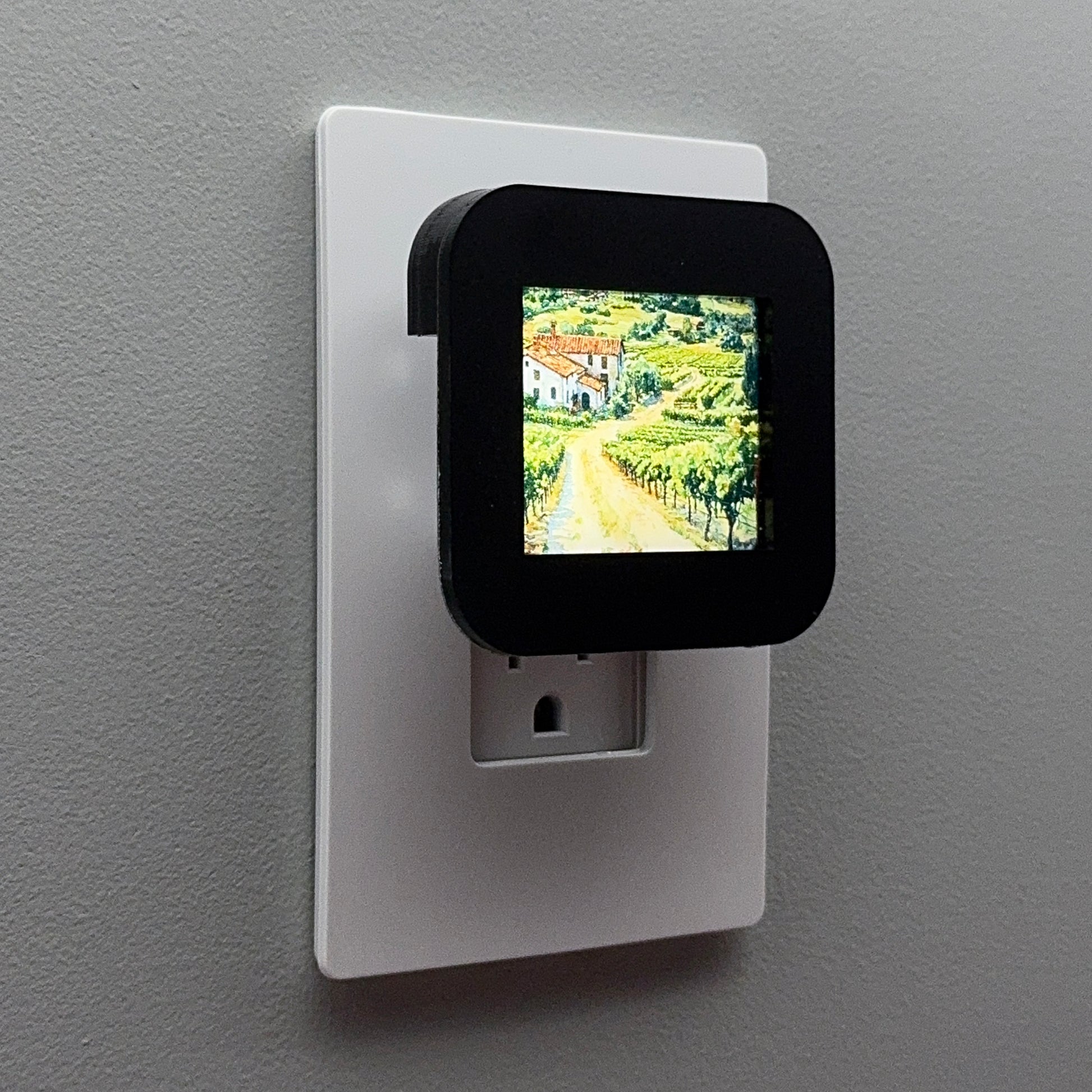 Capture the idyllic beauty of a Mediterranean retreat with this picturesque plug-in night light, featuring a sun-drenched vineyard landscape leading up to a classic Italian farmhouse villa.