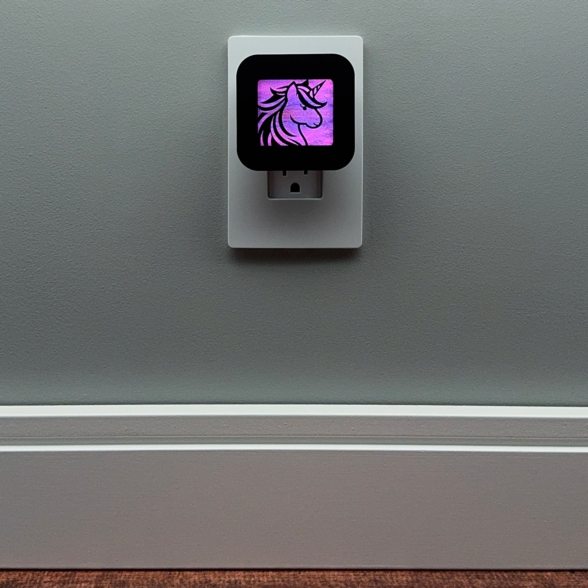 Illuminate your bathroom, hallway, nursery or bedroom with this fun unicorn night light! The laser cut cover slides easily over the included LED nightlight without interfering with the sensor or vents, so it automatically glows when the room darkens and stays cool to the touch.