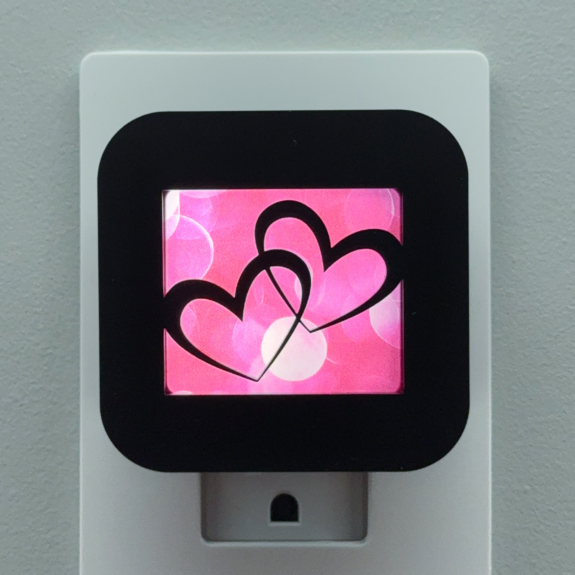 Celebrate love with this charming plug-in night light, featuring two intertwined hearts in front of a pink bubble background.