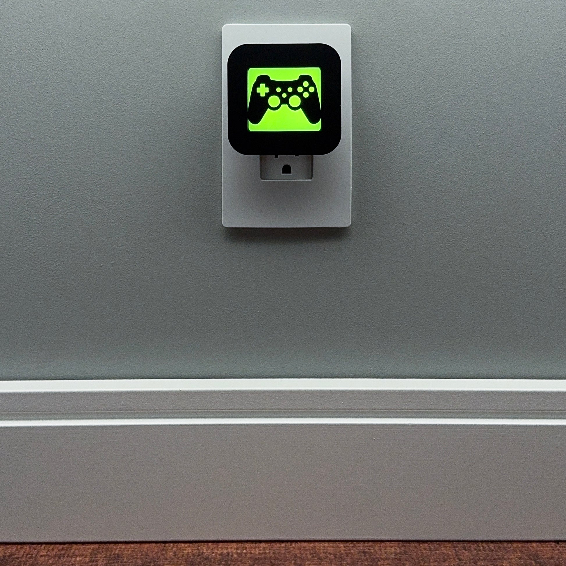 Level up your space with this cool plug-in night light, featuring a classic video game controller silhouette set against a vibrant, electric green background.